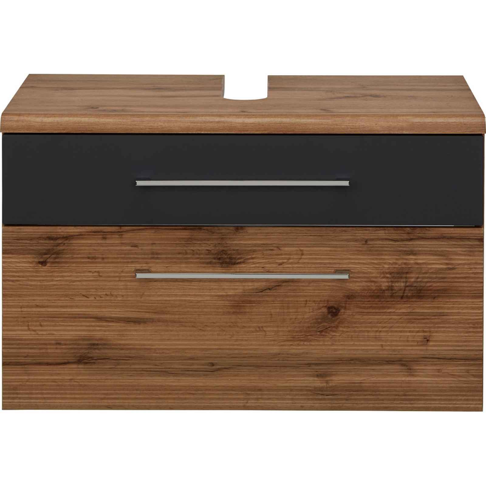Skříňka pod umyvadlo s korpusem v dekoru dub Wotan zásuvky dub Wotan s vroubkovaným povrchem/antracit. Skříňka má 2 zásuvky s jemným dovíráraním, chromovou úchtkovou lištu. Š/V/H: cca 75/60/46 cm