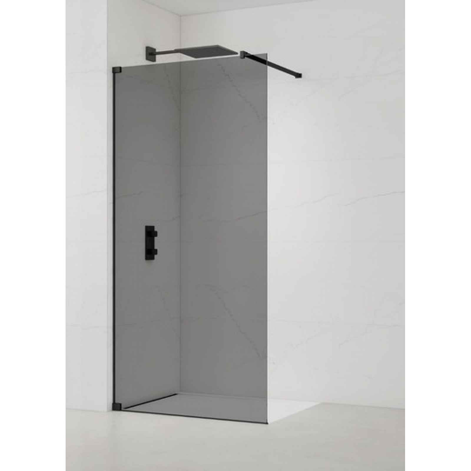 Sprchová zástěna walk-in s panty a zavětrováním s profilem v černé barvě a výplní s neprůhledného skla a výplní z kouřového skla. S povrchovou úpravou Easy Clean, která usnadňuje čistění a minimalizuje usazování vodního kamene. Nelze otevřít - pevný systém. Levá i pravá orientace.