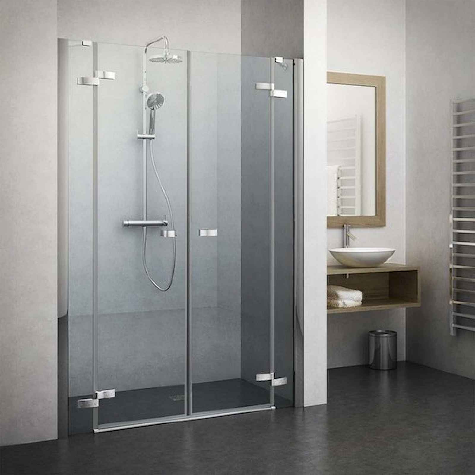 Sprchové dveře bez vaničky s profilem v lesklém chromu a výplní z čirého skla s dekorem transparent. S povrchovou úpravou RothETC je sklo chráněno před usazováním všech nečistot a jeho údržba je snadnější než kdy dřív. Otočný systém otevírání. Levá i pravá orientace.