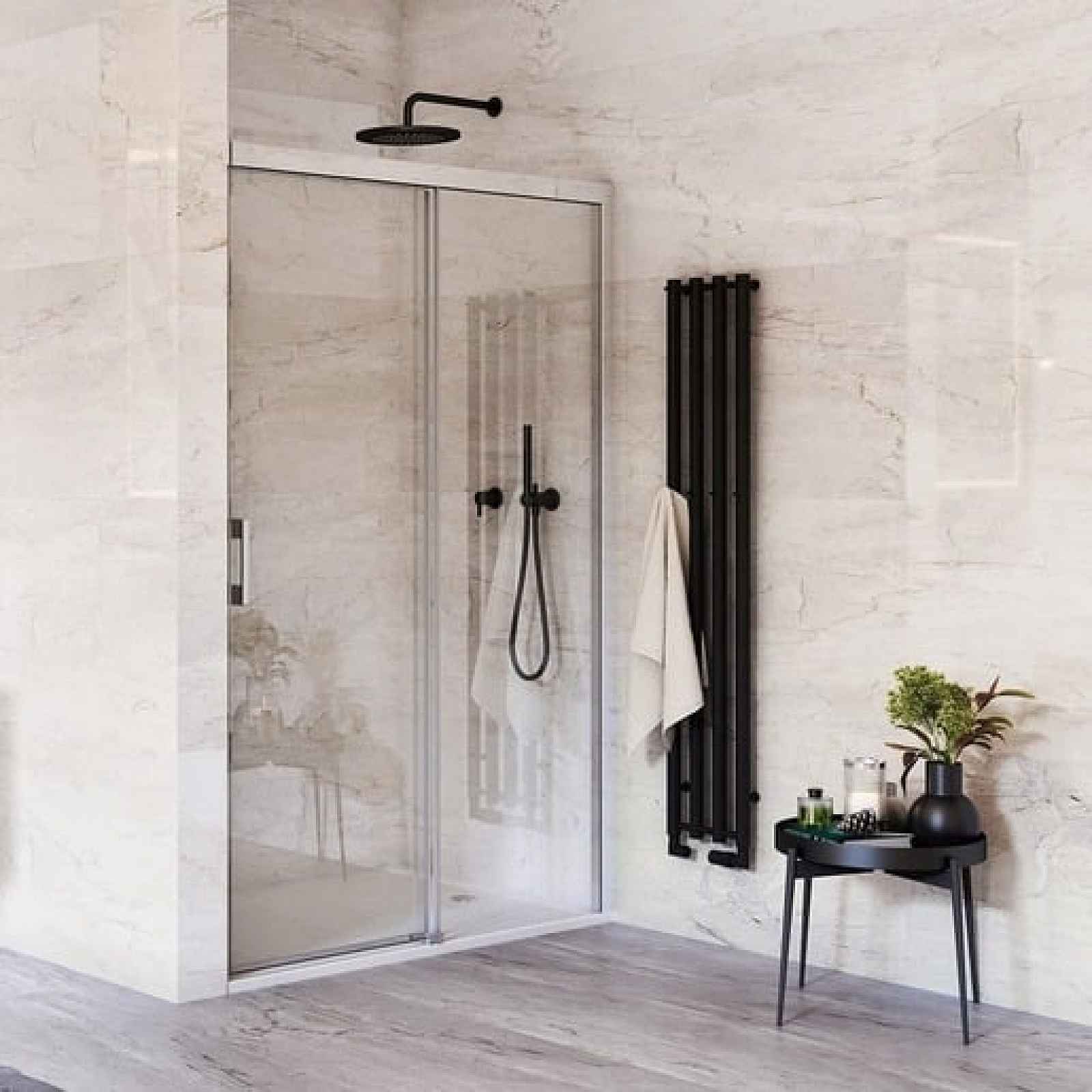Sprchové dveře bez vaničky a barvou profilů v lesklém chromu, výplň je z čirého skla bez dekoru. S povrchovou úpravou RothETC, která zajišťuje jednodušší čištění skla díky svému voděodpudivému efektu. Po takto ošetřeném sklu stéká voda v pramíncích ihned pryč a bere sebou většinu nečistot i vodního kamene. Posuvný systém otevírání. Určení - pravá orientace.