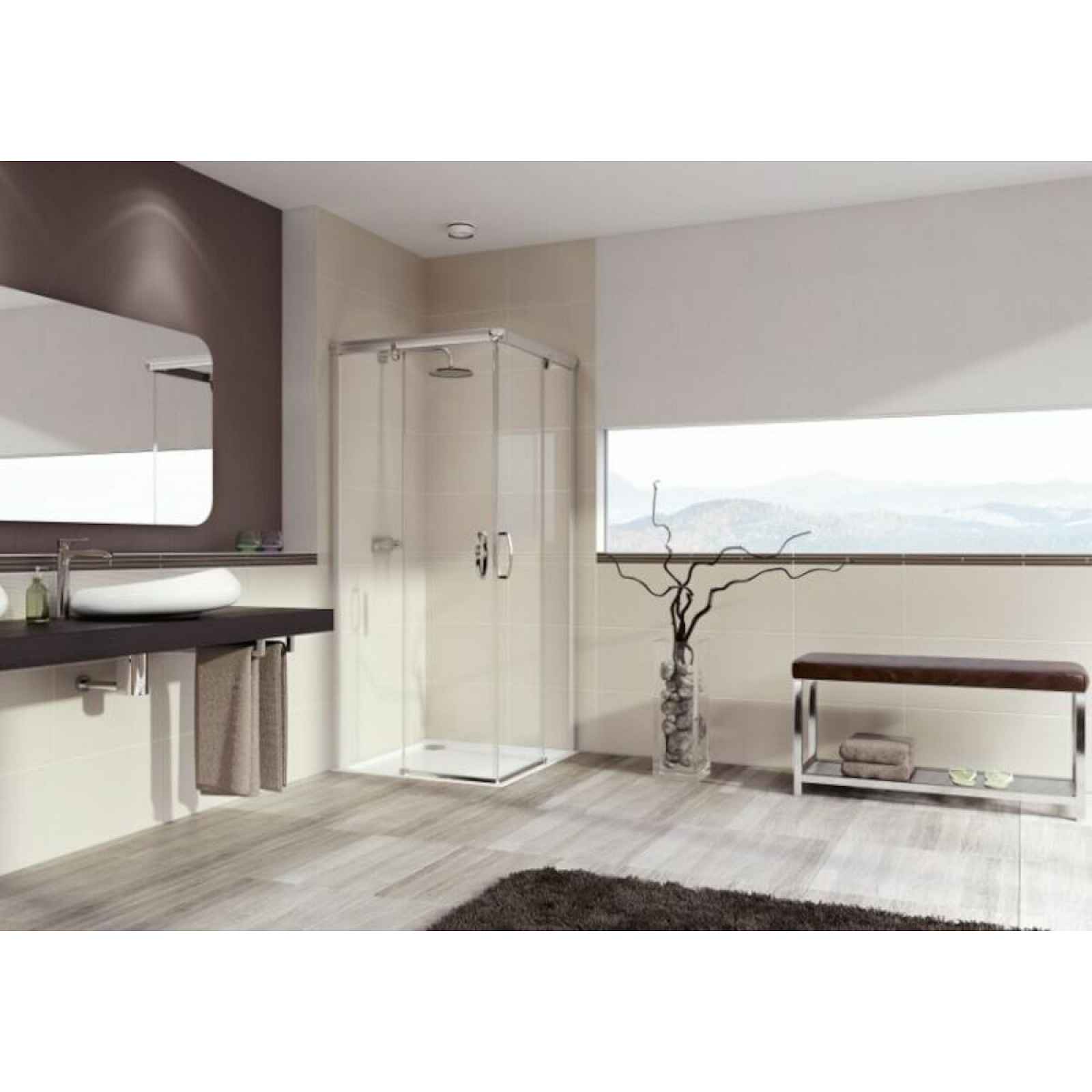 Sprchový kout bez vaničky s profilem v lesklém chromu a výplní z čirého skla s dekorem transparent. S technologií Hüppe Anti-Plaque - povrchová úprava aplikovaná ve výrobě, která usnadňuje čištění a umožňuje jednoduché stékání vody v podobně drobných kapek. Posuvný systém otevírání. Levá i pravá orientace.