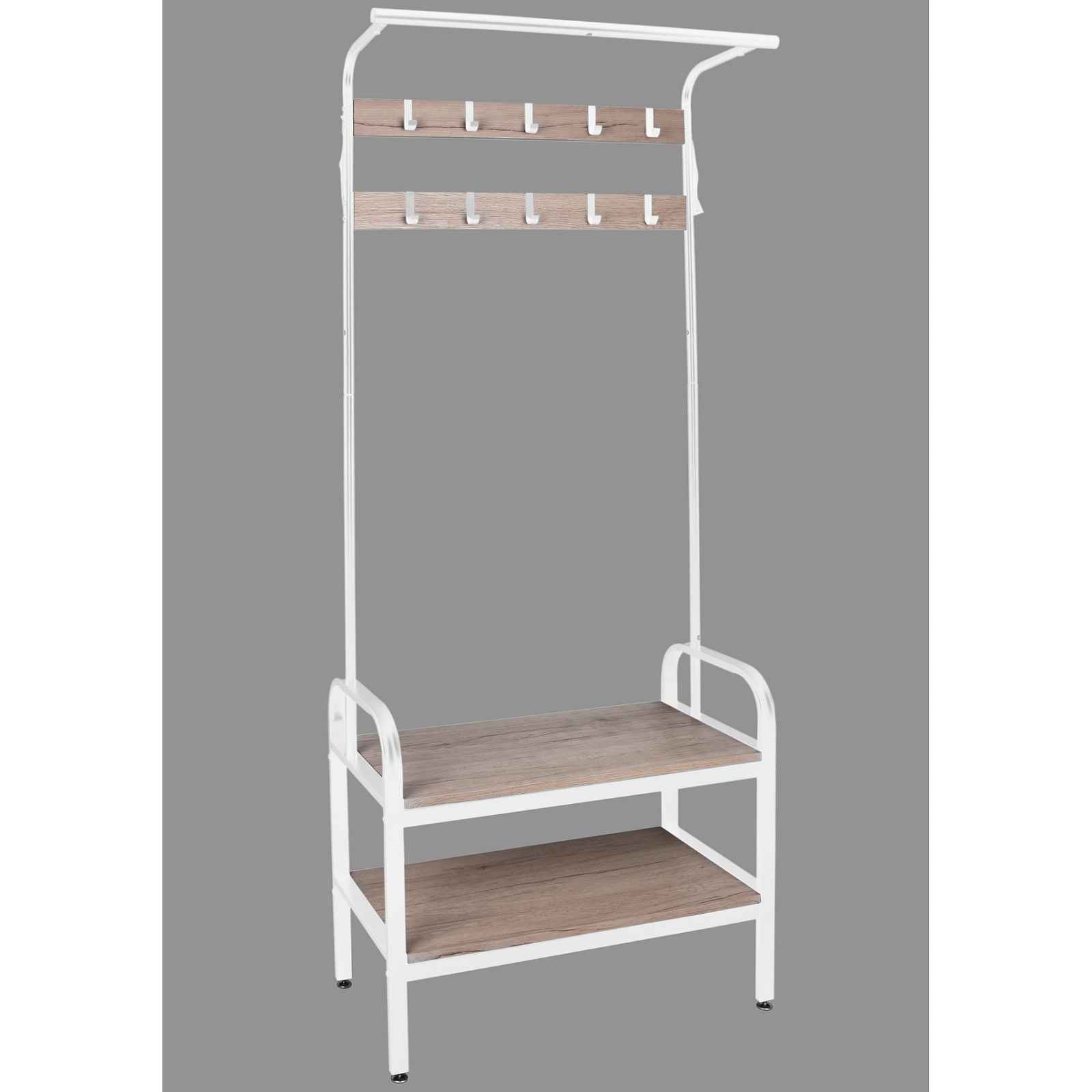 Praktický předsíňový stojací věšák s bílou kovovou konstrukcí, závěsnými háčky a odkládacími poličkami. Může být umístěn nejen do předsíně, ale i do koupelny anebo třeba ložnice. - konstrukce: kov, MDF 15 mm - povrchová úprava: bílý lak - dekor: dub - 1 x horní závěsná tyč (nosnost do 5 kg) - 10 x závěsný hák - 2 x dolní odkládací police (síla 15 mm, nosnost police do 5 kg) - pro ukotvení ke stěně (zadní 2-bodové uchycení) - stabilní - do předsíně, šatny, koupelny nebo ložnice - dodáváno v demontu
