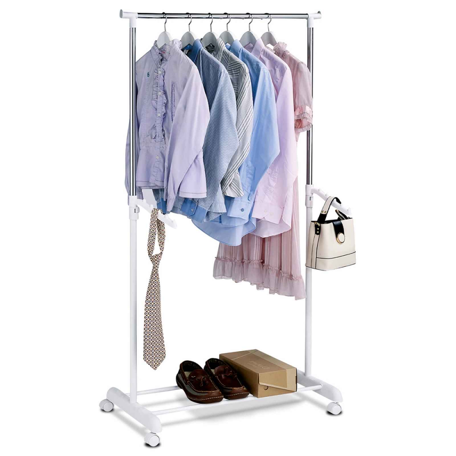 Stojan na šatyBarva: bílá / chromRozměry (šxvxh): 84 x 96-167 x 42 cm Materiál: kov, plast Dodáváno v demontu, záruka 24 měsíců.