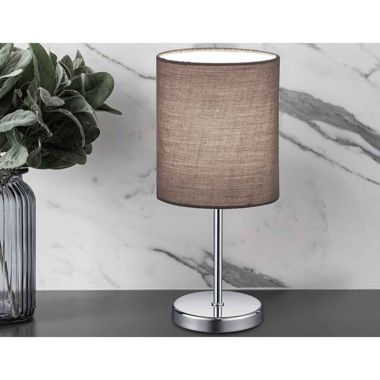 Elegantní stolní lampa s šedým látkovým stínidlem a chromově lesklou konstrukcí, která se hodí do Vaší ložnice i obývacího pokoje.
