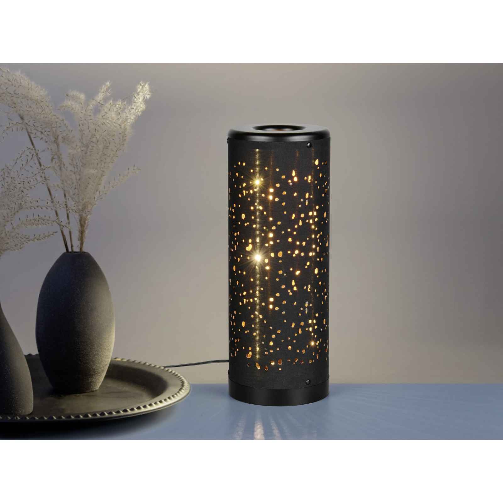 LED stolní lampa ve tvaru válce vykouzlí skrz černo-zlaté látkové stínidlo s otvory neobyčejnou světelnou atmosféru. Výška 34,5 cm. Stolní úsporná LED lampa ve tvaru elegantního válce vykouzlí skrz černo-zlaté látkové stínidlo s otvory neobyčejnou světelnou atmosféru. Zlaté třpytivé světelné efekty připomínající hvězdy dodají vašemu domovu útulnou atmosféru. Výška 34,5 cm. - konstrukce: plast - povrchová úprava: černá matná - konstrukce ve tvaru válce - základna: kruhová - stínidlo: černá/zlatá látka (vnější/vnitřní), otvory vytvářející hvězdný třpytivý efekt - celková výška: 34,5 cm - průměr: 13 cm - počet svítidel: 1 - typ patice: LED SMD - max. výkon: 1×4 W - žárovky: včetně 1 x LED SMD 4 W - světelný tok: 1×380 lumen - barva světla: teplá bílá (3000 kelvin) - stupeň krytí IP: IP20 - třída ochrany: 2 - přívodový kabel s vypínačem - druh osvětlení: stolní - styl: moderní