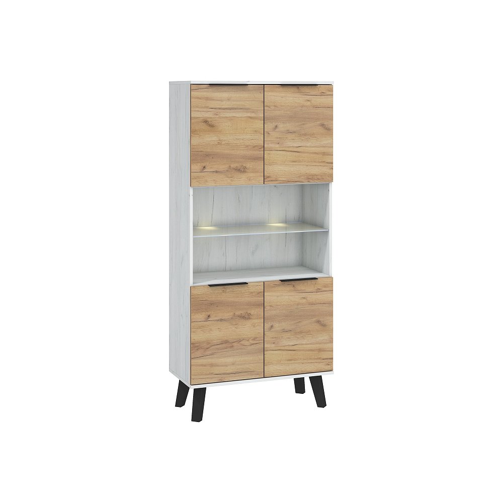 Policový regál se čtyřmi dvířky Barva: - craft bílý/craft zlatý - úchyty a nožky: černá Rozměr (šxvxh): 80 x 174 x 40 cm Výška nožek: 18 cm Materiál: - lamino o síle 16 mm s ABS hranami - dřevěné nožky - sklo Skříňky jsou vybaveny tichým dovíráním. Osvětlení není v ceně regálu. Dodáváno v demontu. Záruka 5 let.