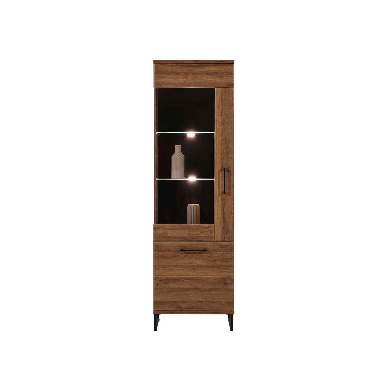 Vitrína s LED Provedení: levé Barva: dub april Rozměry (šxvxh): 58 x 194 x 40 cm Materiál: lamino, MDF, nožky - kov LED osvětlení v ceně Dodání v demontu. Záruka 24 měsíců.