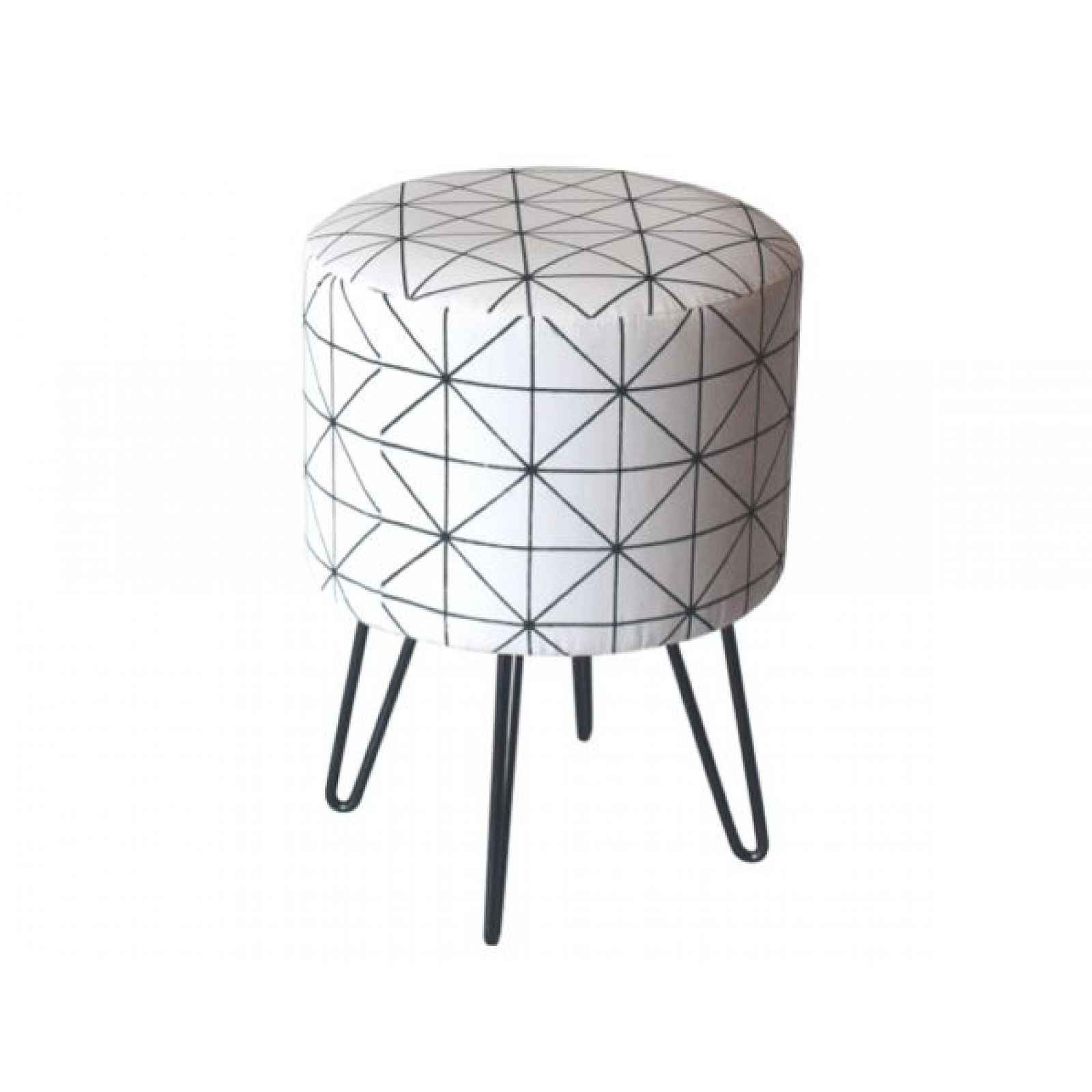 Taburet s kovovými nohami. Sedák je čalouněný bílou látkou s černým potiskem. Taburet nemá úložný prostor. Rozměry: - šířka 30 cm - hloubka 30 cm - výška 38 cm