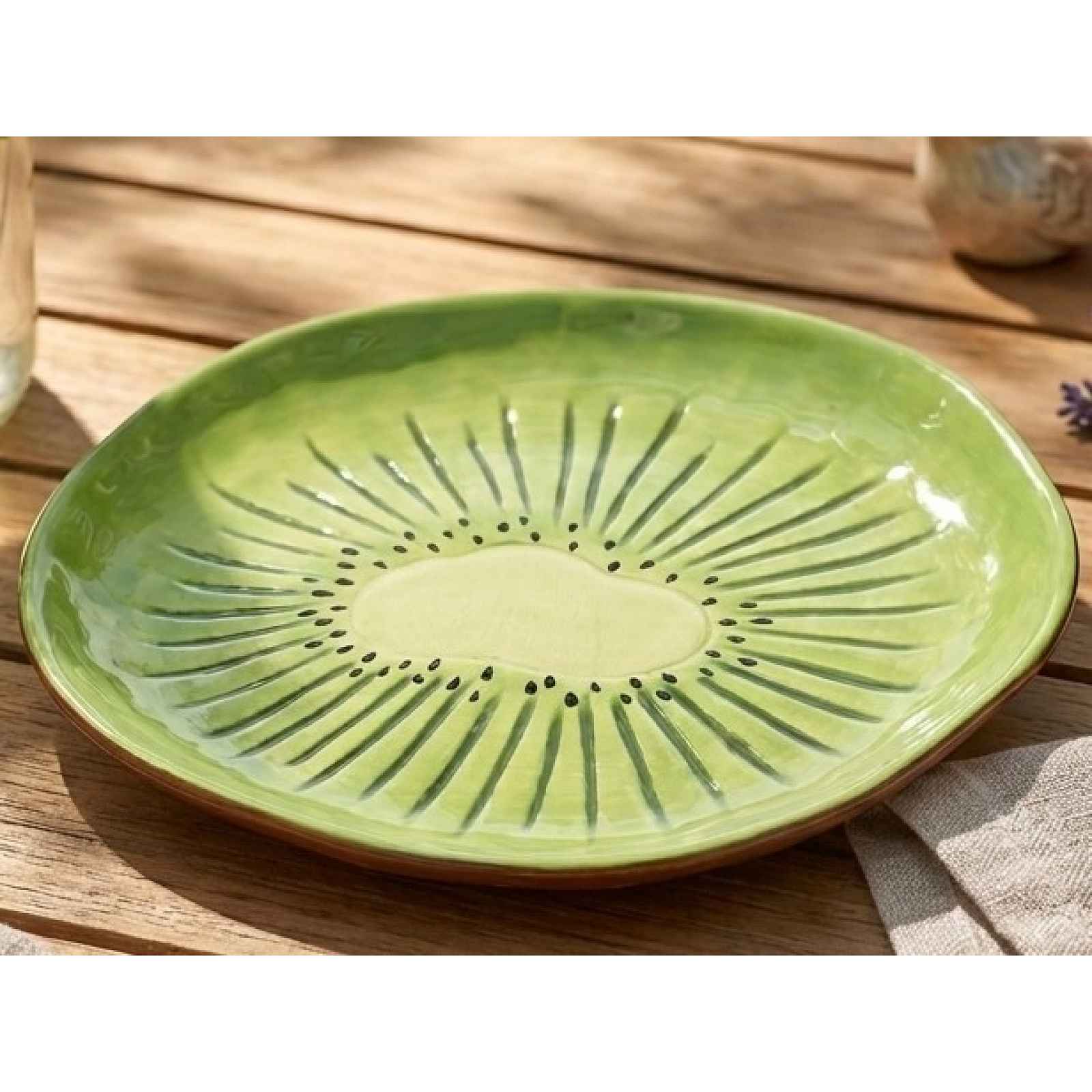 Stylový dezertní talíř s motivem kiwi je praktickým i designovým doplňkem do kuchyně i na zahradu. Průměr 15 cm. Stylový dezertní talíř s motivem kiwi je praktickým i designovým doplňkem do kuchyně i na zahradu. Svým hravým vzhledem dodá šmrnc každému stolování, ať už podáváte drobné občerstvení, nebo pořádáte letní party na zahradě. Průměr 15 cm. - materiál: lakovaný dolomit - barva: zelená - povrchová úprava: lesk - motiv: kiwi - letní atmosféra po celý rok - univerzální použití: ideální pro stolování nebo jako dekorace - průměr: 15 cm