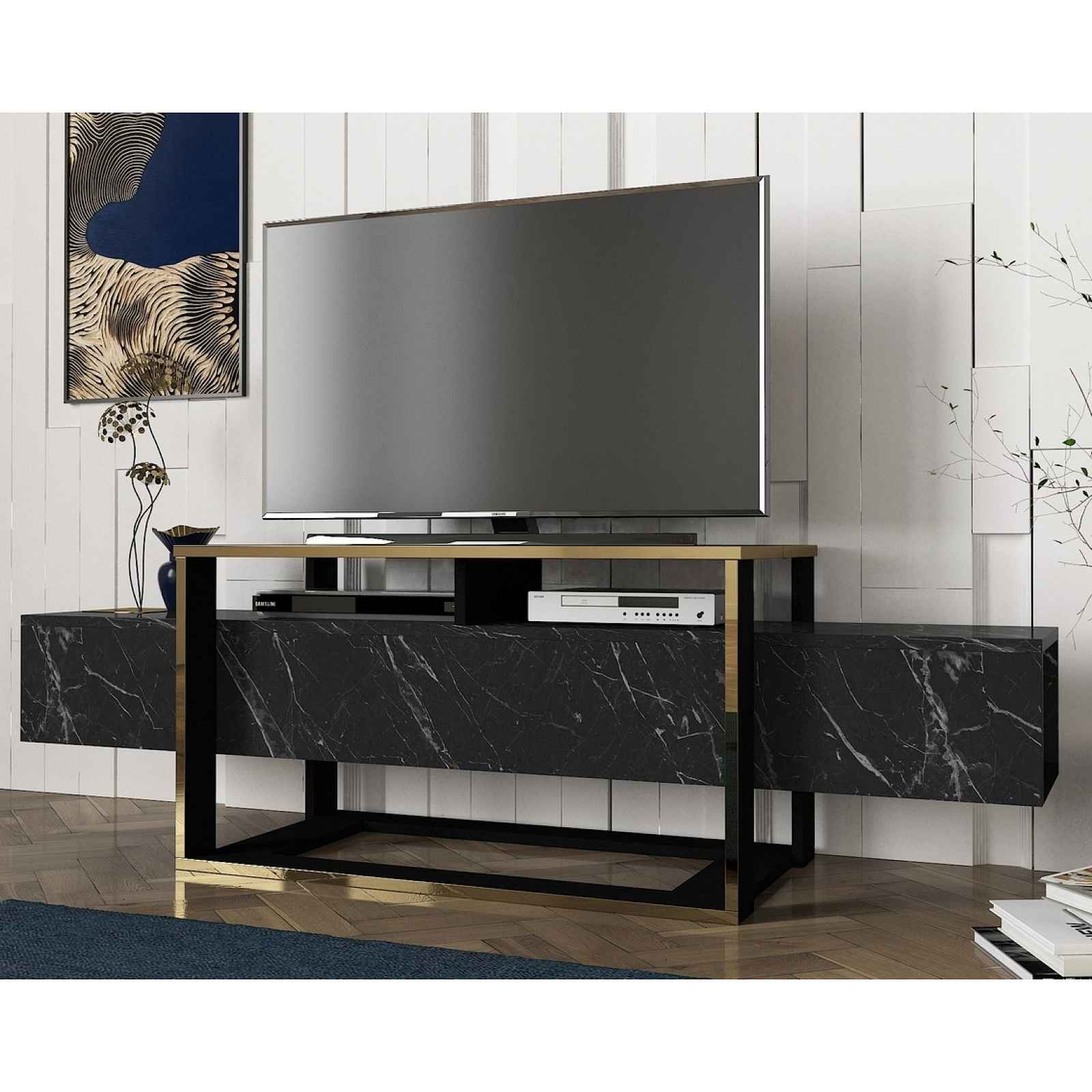 Televizní stolek je vyroben z kvalitního lamina o tl.18 mm hraněné PVC páskou, odolného proti poškrábání v barvě marble. Černá kovová konstrukce je lemovaná zlatou barvou. Na bocích se nachází praktický úložný prostor. Barva: marble Rozměry (šxvxh): 160 x 49,8 x 46,1 cm Materiál: LTD (lamino) Dodání v demontu.
