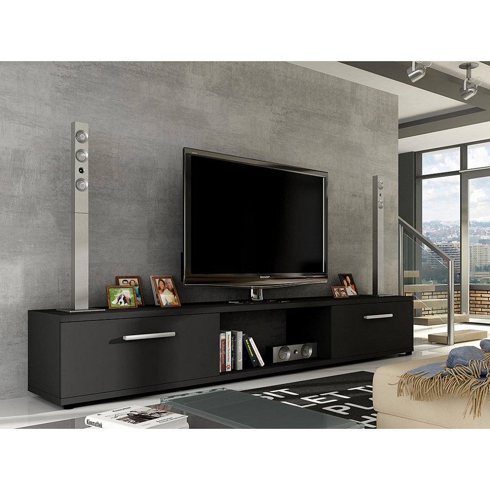 Televizní stolek Barva: černý mat Rozměry (šxhxv): 176 x 40 x 28 cm Materiál: - laminovaná deska o tloušťce 16 mm, hrany ABS Dvířka jsou výklopná. Dodání v demontu. Záruka 24 měsíců.