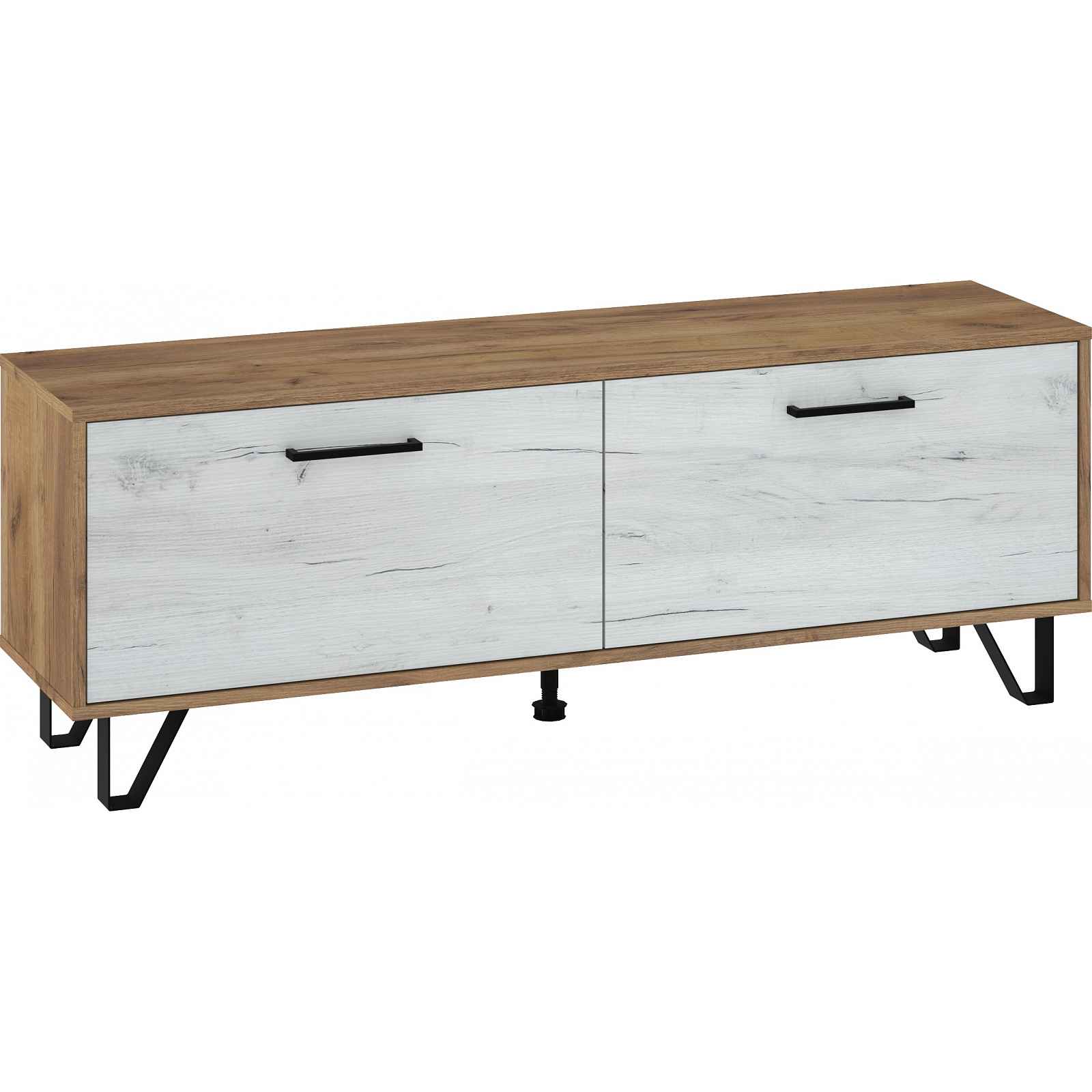 Televizní stolek 140 cm Barva: - craft zlatý/craft bílý - nožky a úchytky: černá Rozměr (šxvxh): 140 x 50 x 39 cm Výška nožek: 12 cm Materiál: - lamino 16 mm, ABS hrany - nožky: kov Nosnost: - horní deska: max. 25 kg - police: max. 5 kg Disponuje systémem tichého dovírání. Dodáváno v demontu.Záruka 5 let.