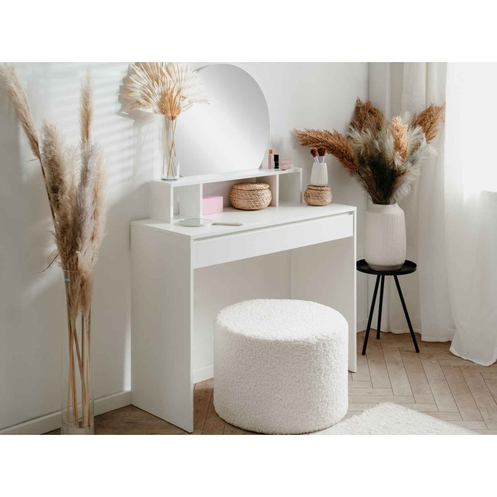 Toaletní stolek se zrcadlem z programu Image - minimalistický design nábytku je zcela univerzální a hodí se do každého moderního interieru. Tento kosmetický stolek obsahuje zakulacené zrcadlo, otevřené odkládací přihrádky i praktickou širokou zásuvku pro ukládání kosmetických potřeb, které budete mít vždy při ruce. - toaletní stolek z programu Image - materiál: laminovaná dřevotříska 16 mm, kov, plast, zrcadlové sklo - dekor: bílá mat - úchyt: bezúchytové otevírání boční hranou - nožky: plast, mini-kluzáky - moderní minimalistický styl - celková šířka: 100 cm - pracovní/odkládací plocha: 100×39 cm - výška pracovní plochy: 76 cm - zakulacené zrcadlo (ukotvené ke konstrukci) - 3 x otevřená odkládací přihrádka - 1 x zásuvka (kovové boční pojezdy) - volná šířka pod stolkem pro umístění židle: 97 cm - zadní uchycení ke stěně (2-bodové) - dodáváno v demontu