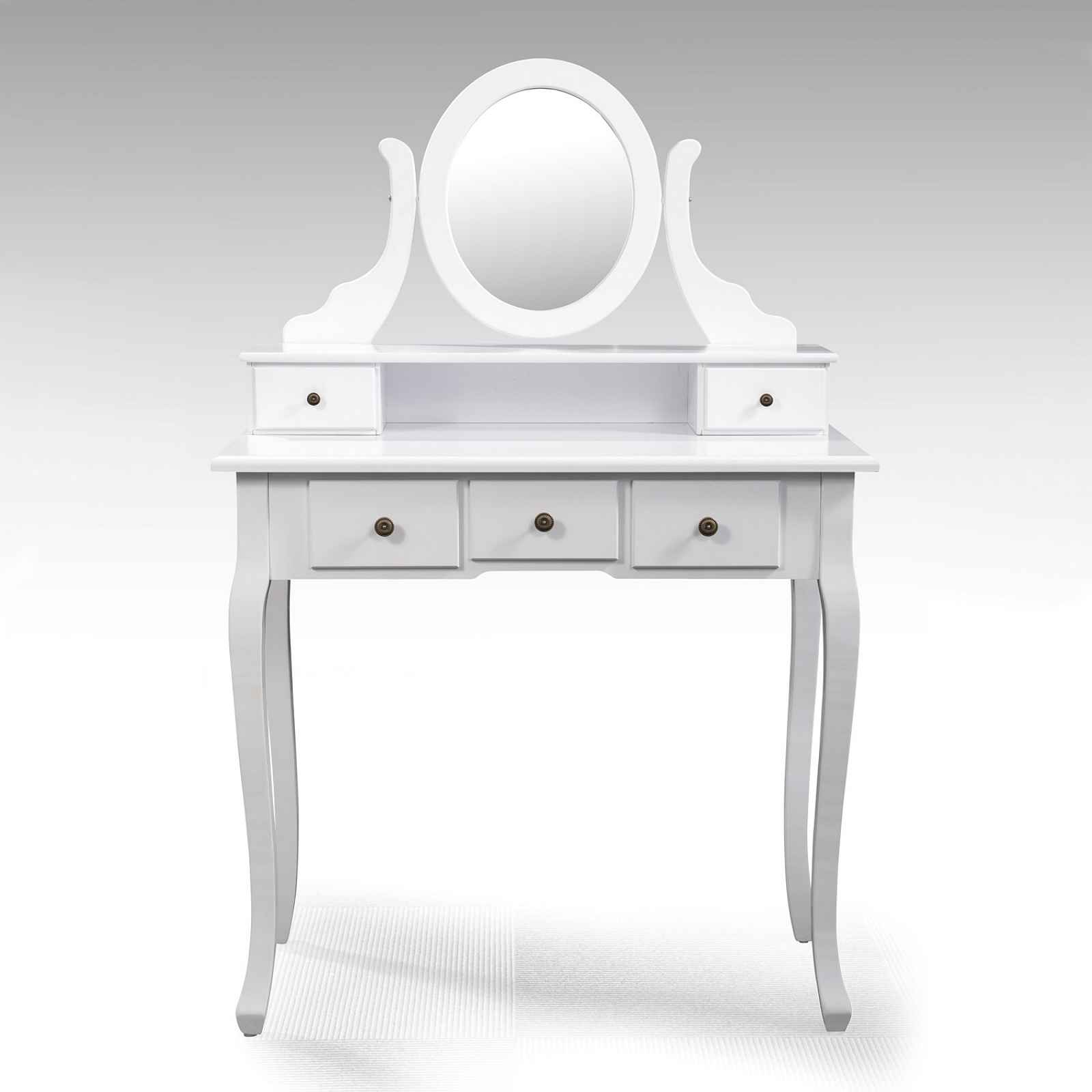 Toaletka se zrcadlem Materiál: MDF, nohy borovice Barevné provedení: bílá 2 menší a 3 větší zásuvky Rozměry (šxhxv): 80 x 40 x 136 cm Dodáváno v demontu, záruka 24 měsíců.