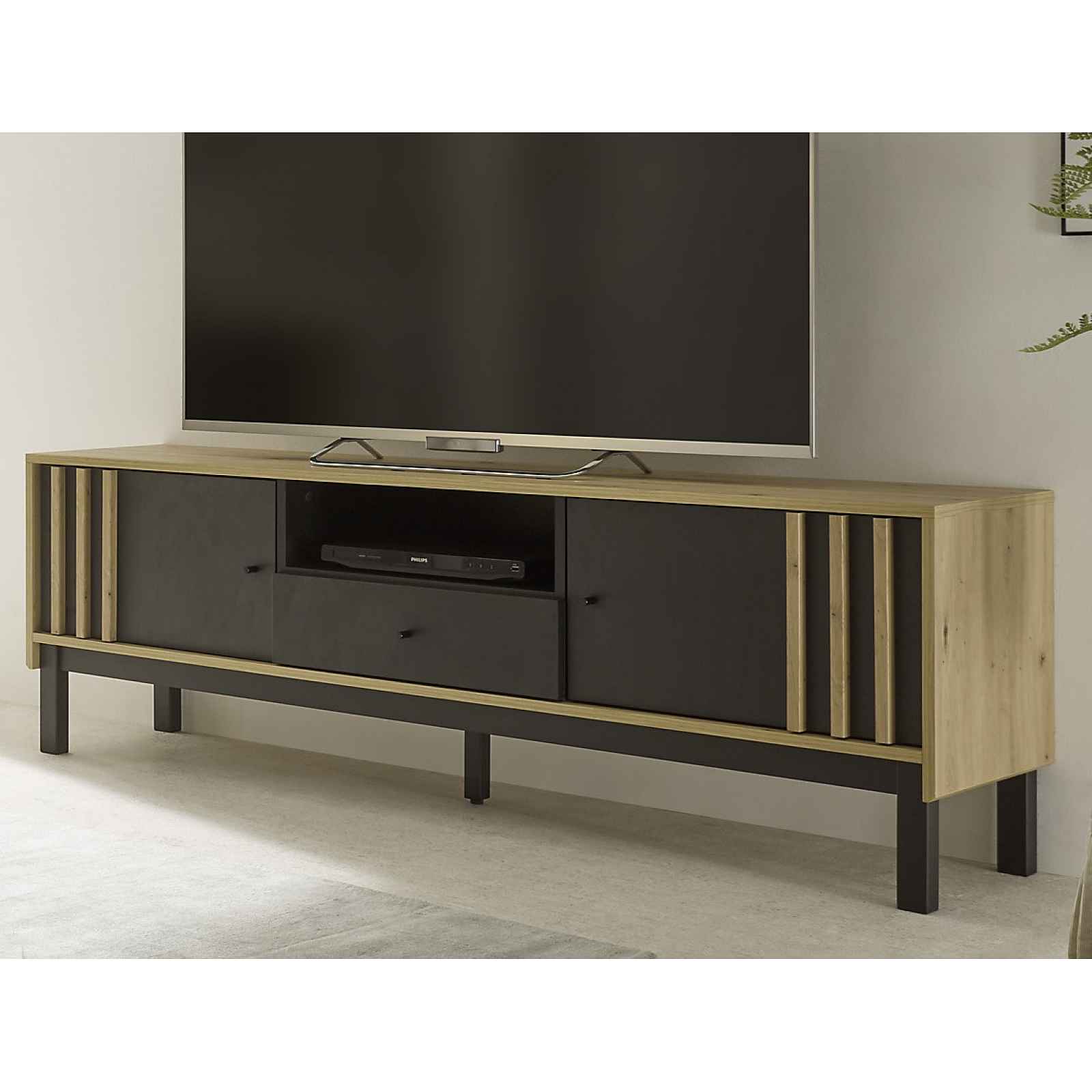 TV skříňka z programu Volano - moderní nábytek v kontrastní kombinaci dřevodekoru dub artisan s černými plochami navíc doplňují lamely na předních plochách. Nábytek tak působí zajímavým a nezaměnitelným dojmem. Černá vyšší podnož naopak umožňuje snazší údržbu podlahy pod nábytkem. - TV skříňka z programu Volano - materiál: laminovaná dřevotříska 16 mm, MDF 18 mm, kov, plast - dekor korpus: dub artisan - dekor přední plochy: dub artisan/černá mat - lamely na předních plochách (dub artisan) - úchyt: plast, černá - nožky: plast, hranatý profil 4x3,5 cm, černá, výška 20 cm (možné využít robotický vysavač) - moderní a zajímavá optika - šířka: 155 cm - 1 x levé dveře (otevřený úložný prostor) - 1 x otevřená přihrádka (zádový otvor) - 1 x zásuvka (kovové boční pojezdy) - 1 x pravé dveře (otevřený úložný prostor) - doporučená nosnost horní TV plochy do 15 kg - dodáváno v demontu