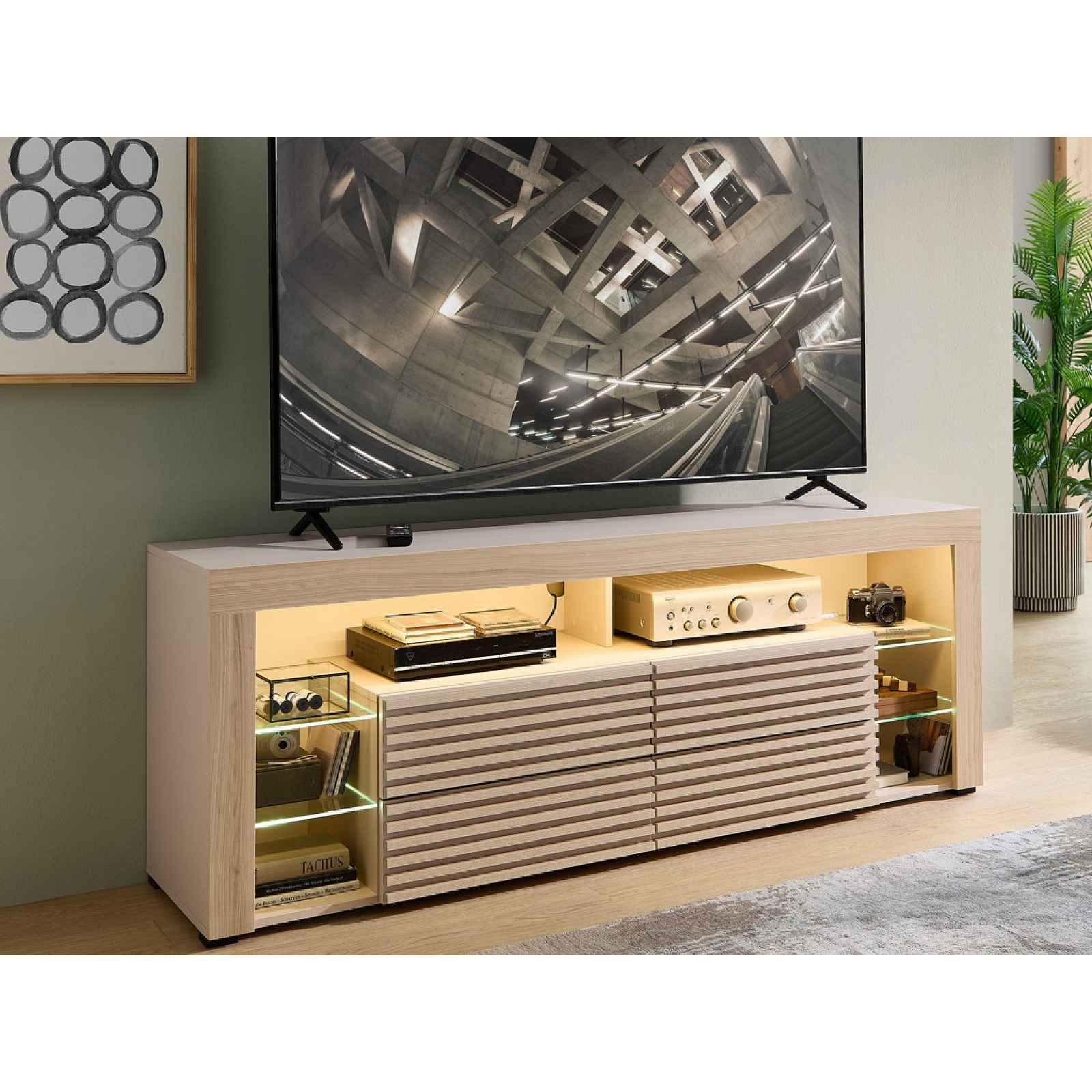 a/v/h: 179x67x44 cm TV stolek v moderním stylu o celkové šířce 179 cm má optiku širokých rámů a jeho přední plochy doplňují dekorační lamely. Vyroben v kombinaci béžová kašmír/dub riva. Obsahuje úložné zásuvky, otevřené přihrádky i skleněné police s působivým LED osvětlením., které dotváří příjemnou večerní atmosféru. - materiál: laminovaná dřevotříska 16 mm, MDF 32 mm, kov, plast, čiré sklo - dekor korpus: béžová kašmír mat - dekor přední plochy: béžová kašmír mat/dub riva - úchyt: bezúchytové otevírání - nožky: hranatý profil, černá - optika širokých předních rámů - dekorační lamely na předních plochách - šířka: 179 cm - 4 x úložná zásuvka (kovové boční pojezdy) - 6 x otevřená přihrádka (zádový pro protažení el. kabelů) - 4 x čirá skleněná police (doporučená nosnost do 3 kg) - včetně LED osvětlení skleněných polic (sada 4 ks LED světla, barva teplá bílá, včetně trafa a přívodového kabele) - včetně LED osvětlení vnitřního prostoru (1 x LED světelný pásek, barva teplá bílá, včetně trafa a přívodového kabelu) - doporučená nosnost horní TV plochy do 30 kg - moderní styl - dodáváno v demontu