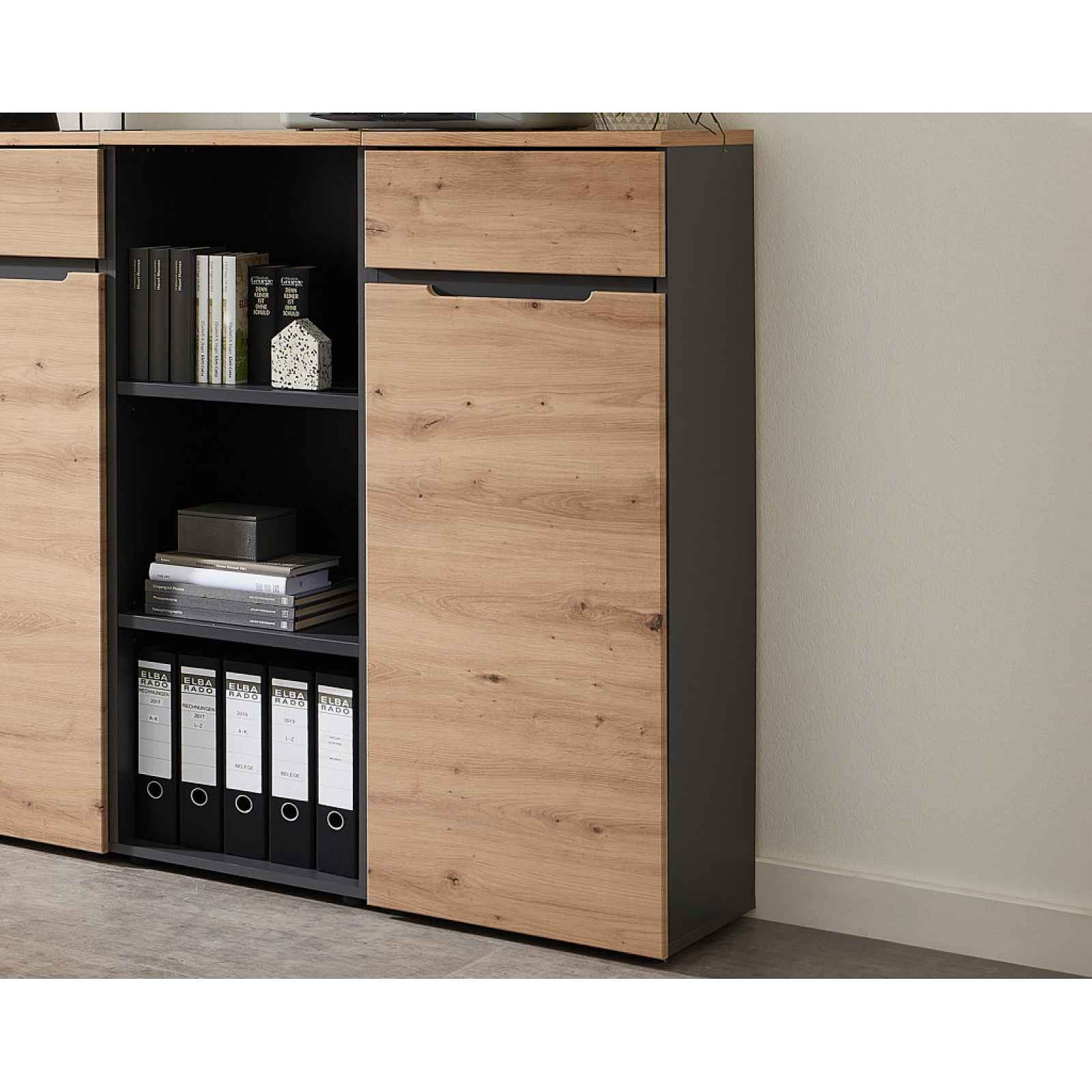 Úložná skříňka z programu Memphis – nábytek v moderním a zároveň funkčním designu zaujme zajímavou profilací předních ploch. Úzká úložná skříňka z kancelářského programu Memphis – nábytek v moderním a zároveň funkčním designu zaujme zajímavou profilací předních ploch. Nábytek je vyroben v kontrastní kombinaci grafit s útulným dřevodekorem dub artisan. Skříňka nabízí úložný prostor pro různé potřeby a předměty. Se svými kompaktními rozměry se dobře vejde do menších místností a přesto nabízí dostatek místa pro uložení knih, šanonů, ručníků a dalších předmětů. Tato skříňka je všestranná a je ideální do pracovny, koupelny, chodby i obýváku. S rozměry 45×122×38 cm nabízí tato skříňka dostatek prostoru pro přehledné uložení nejrůznějších věcí. - úložná skříňka z programu Memphis - materiál: laminová dřevotříska 16 mm/22 mm, MDF 18 mm, kov, plast - dekor: dub artisan/grafit mat - úchyt: bezúchytové otevírání boční hranou - nožky: kluzáky, plast, černé - zajímavá profilace předních ploch - tiché dovírání dveří Softclose - moderní, elegantní styl - šířka: 45 cm - 1 x otočné dveře (uni montáž jako pravé/levé, úložný prostor, 2 x police - výškově nastavitelné, max. doporučená nosnost 12 kg) - univerzální využití pro práci i domácnost: pro uložení kancelářských potřeb, bytových doplňků, hraček nebo oblečení - zadní ukotvení ke stěně - vyrobeno v EU - dodáváno v demontu