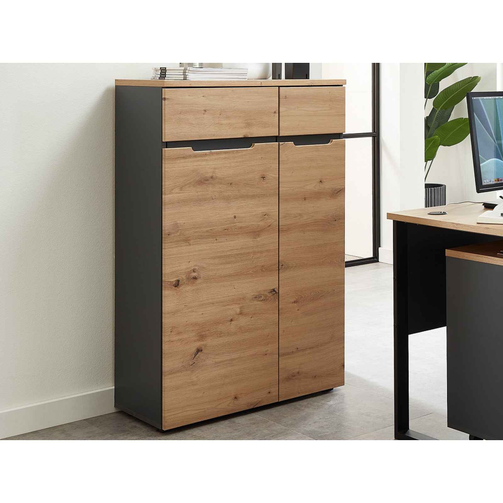 Úložná skříňka z programu Memphis – nábytek v moderním a zároveň funkčním designu zaujme zajímavou profilací předních ploch. Úložná skříňka z kancelářského programu Memphis – nábytek v moderním a zároveň funkčním designu zaujme zajímavou profilací předních ploch. Nábytek je vyroben v kontrastní kombinaci grafit s útulným dřevodekorem dub artisan. Skříňka nabízí úložný prostor pro různé potřeby a předměty. Se svými kompaktními rozměry se dobře vejde do menších místností a přesto nabízí dostatek místa pro uložení knih, šanonů, ručníků a dalších předmětů. Tato 2-dveřová skříňka je všestranná a je ideální do pracovny, koupelny, chodby i obýváku. S rozměry 75×122×38 cm nabízí tato skříňka dostatek prostoru pro přehledné uložení nejrůznějších věcí. - úložná skříňka z programu Memphis - materiál: laminová dřevotříska 16 mm/22 mm, MDF 18 mm, kov, plast - dekor: dub artisan/grafit mat - úchyt: bezúchytové otevírání boční hranou - nožky: kluzáky, plast, černé - zajímavá profilace předních ploch - tiché dovírání dveří Softclose - moderní, elegantní styl - šířka: 75 cm - 2 x otočné dveře (úložný prostor, 2 x police - výškově nastavitelné, max. doporučená nosnost police do 20 kg) - univerzální využití pro práci i domácnost: pro uložení kancelářských potřeb, bytových doplňků, hraček nebo oblečení - zadní ukotvení ke stěně - vyrobeno v EU - dodáváno v demontu