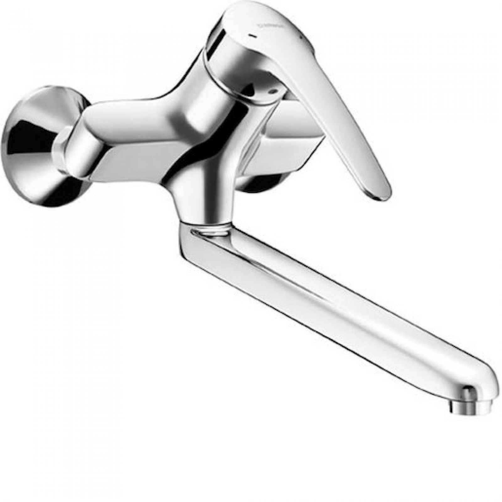 Páková nástěnná umyvadlová baterie s otočným ramínkem. V chromovém provedení. Průtok baterie je 6 litrů/minutu. Rozteč baterie 150 mm.