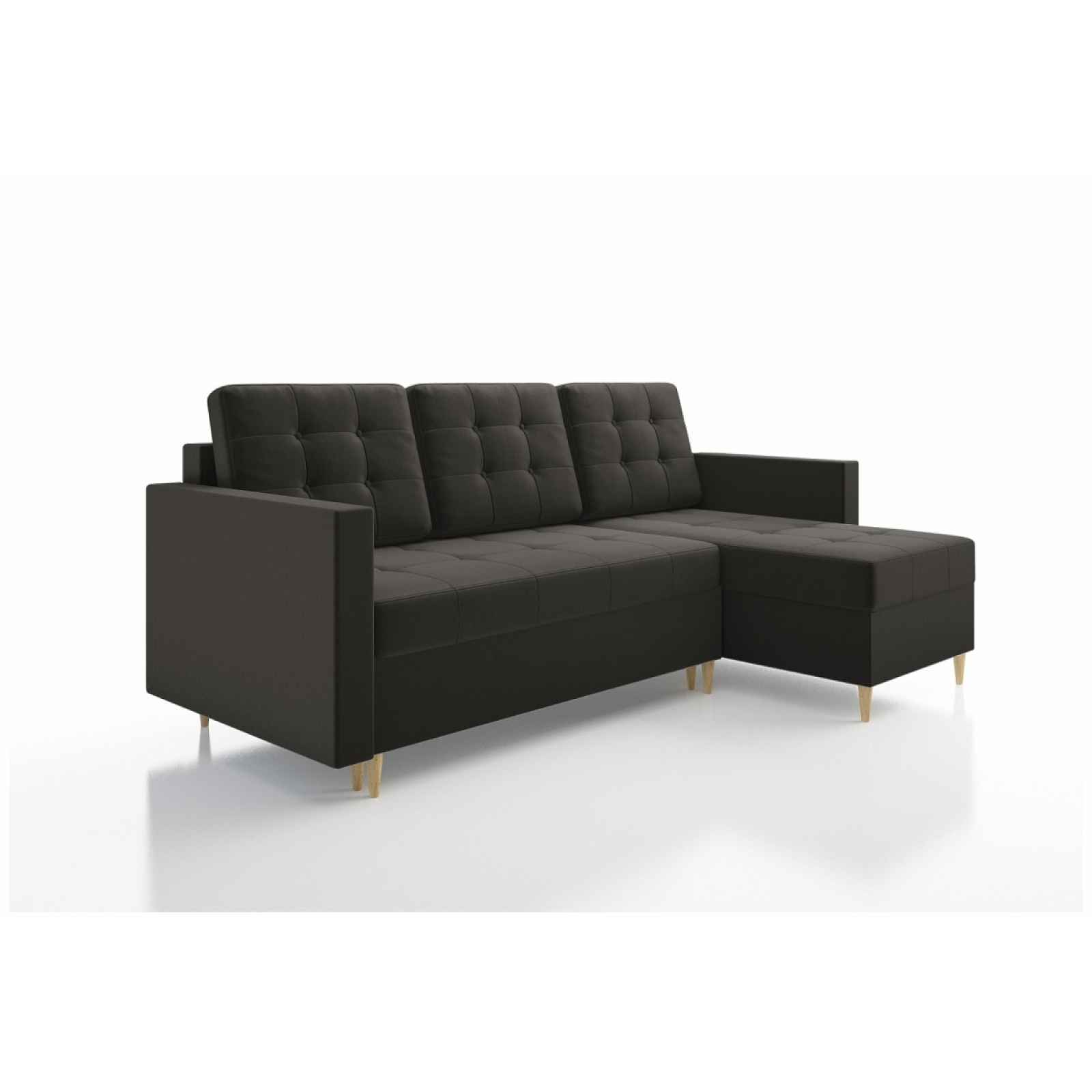 Rozkládací rohová sedačka.Sedačka má prošívaný sedák a polštáře.Materiál:- nohy: bukové dřevo- výplň: polyuretanová pěna T30- látka: kronos 34 - tmavě šedáRozměry (šxvxh): 225 x 84 x 145 cm- výška sedu: 43 cm- hloubka sedu: 75 cm- hloubka sedu otomanu: 130 cm- plocha po rozložení na spaní: 140 x 200 cmSedačka má čalouněná záda = lze ji umístit do prostoru.Dodáváno v demontu.