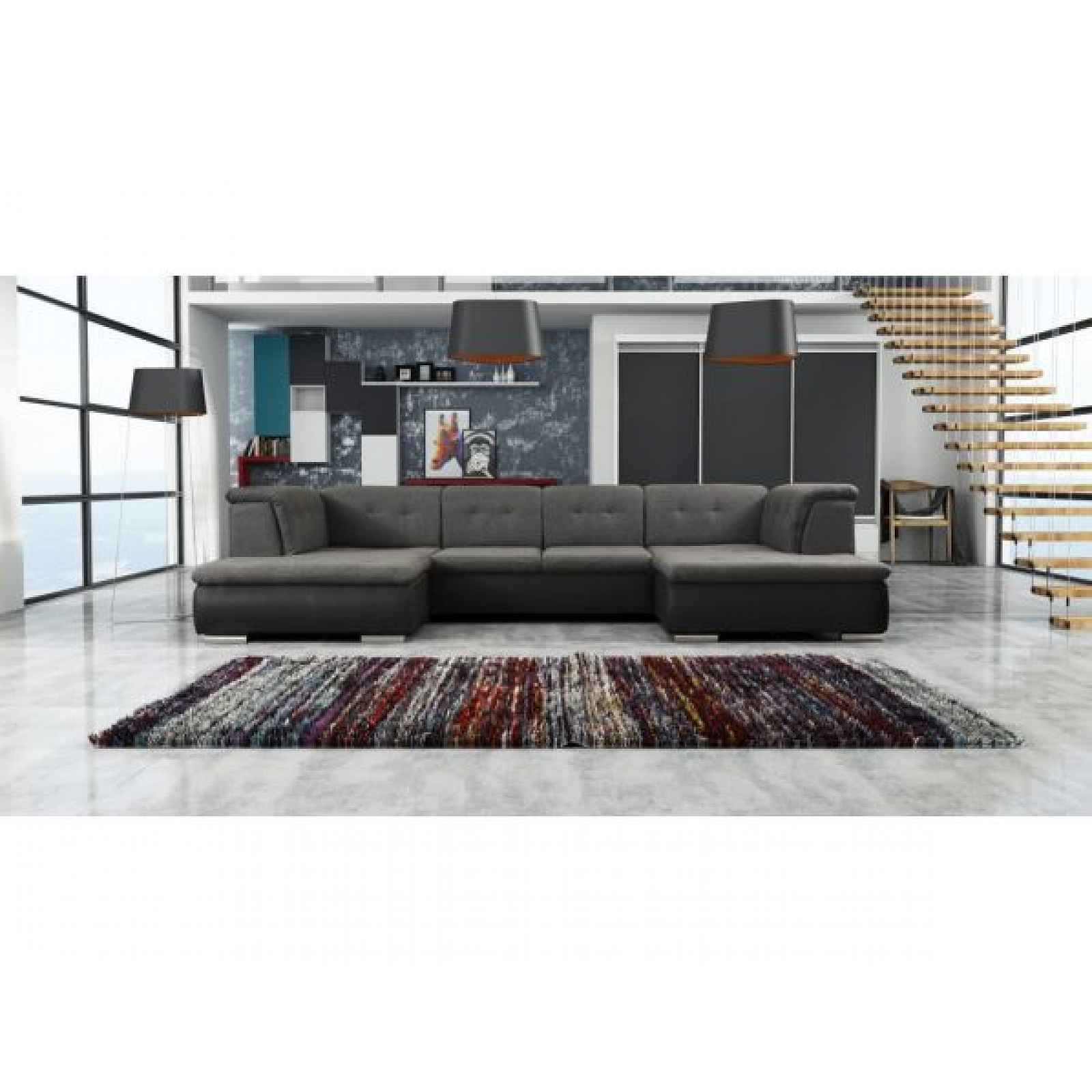 Prostornou sedací soupravu Santiago nabízíme v černé ekokůži Madryt 1100 (korpus), sedáky a opěráky jsou čalouněné šedou látkou Inari 96. Sedací souprava ve tvaru U má snadno rozložitelnou spací funkci a 2 úložné prostory pro ložní prádlo. Prošívání na sedáku a opěradlech tvoří atraktivní vizuální prvek. Sedací souprava Santiago bude krásným doplňkem každého obývacího pokoje. Moderní rohové sedací soupravy se vyznačují nejen atraktivním vzhledem, ale také řešeními, která ovlivňují funkčnost při používání. Rohová sedací souprava Santiago je právě takový model. Při její výrobě byl kladen důraz na pohodlí při odpočinku a obecný komfort používání.