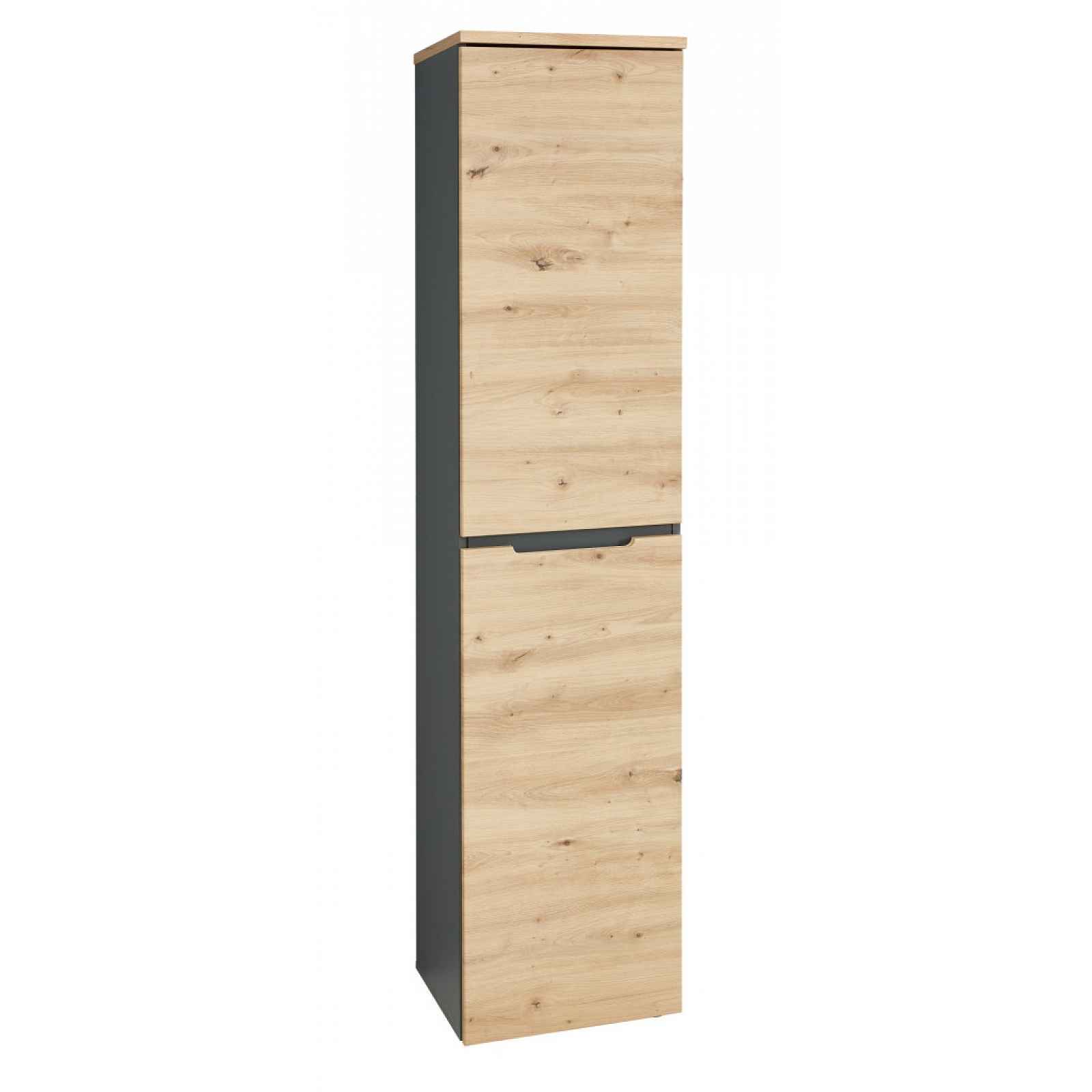 Univerzální skříň s policemi z programu Memphis – nábytek v moderním a zároveň funkčním designu zaujme zajímavou profilací předních ploch. Úzká univerzální skříň s policemi z kancelářského programu Memphis – nábytek v moderním a zároveň funkčním designu zaujme zajímavou profilací předních ploch. Nábytek je vyroben v kontrastní kombinaci grafit s útulným dřevodekorem dub artisan. Skříň nabízí úložný prostor pro různé potřeby a předměty. Se svými kompaktními rozměry se dobře vejde do menších místností a přesto nabízí dostatek místa pro uložení knih, šanonů, ručníků a dalších předmětů. Policová skříň je všestranná a je ideální do moderní kanceláře, domácí pracovny, koupelny, ložnice i třeba obývacího pokoje. - univerzální skříň s policemi z programu Memphis - materiál: laminová dřevotříska 16 mm/22 mm, MDF 18 mm, kov, plast - dekor: dub artisan/grafit mat - úchyt: bezúchytové otevírání boční hranou - nožky: kluzáky, plast, černé - zajímavá profilace předních ploch - tiché dovírání dveří Softclose - moderní, elegantní styl - šířka: 45 cm - 1 x otočné dveře (uni montáž jako pravé/levé, úložný prostor, 4 x police, max. doporučená nosnost police do 12 kg) - univerzální využití pro práci i domácnost: pro uložení kancelářských potřeb, bytových doplňků, hraček nebo oblečení - zadní ukotvení ke stěně - vyrobeno v EU - dodáváno v demontu