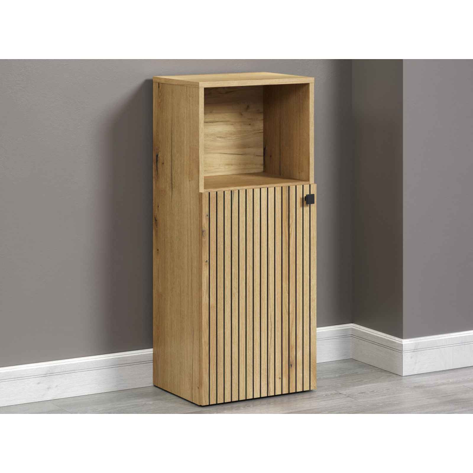 Univerzální skříňka 40 cm z kolekce Pure Bliss zaujme lamelovým vzhledem a dubovým dřevodekorem. Univerzální skříňka nejen do koupelny z kolekce Pure Bliss – moderní nábytek zaujme frézovanými čelními plochami v lamelové optice a útulným dřevodekorem dub evoke. Za otočnými dvířky najdete úložný prostor s poličkou. Do otevřené přihrádky můžete snadno odkládat např. ručníky, osušky nebo třeba kosmetické potřeby. Šířka 40 cm. - univerzální skříňka z kolekce Pure Bliss - materiál: laminovaná dřevotříska 16 mm, MDF 16 mm, kov - dekor: dub evoke - strukturované frézované přední plochy v lamelové optice - úchyt: kov, černá mat, tvar čtverec - moderní a útulný styl - šířka: 40 cm - 1 x otevřená přihrádka (max. doporučená nosnost do 5 kg) - 1 x dolní dveře (uni montáž pravé/levé, úložný prostor, 1 x police - max. doporučená nosnost do 5 kg) - zadní ukotvení ke stěně - dodáváno v demontu