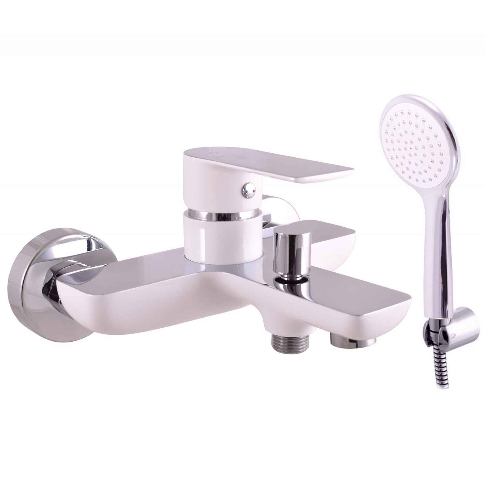 Páková nástěnná VANOVÁ BATERIE se sprchovým setem. V provedení bílá a chrom. Rozteč baterie 150 mm.