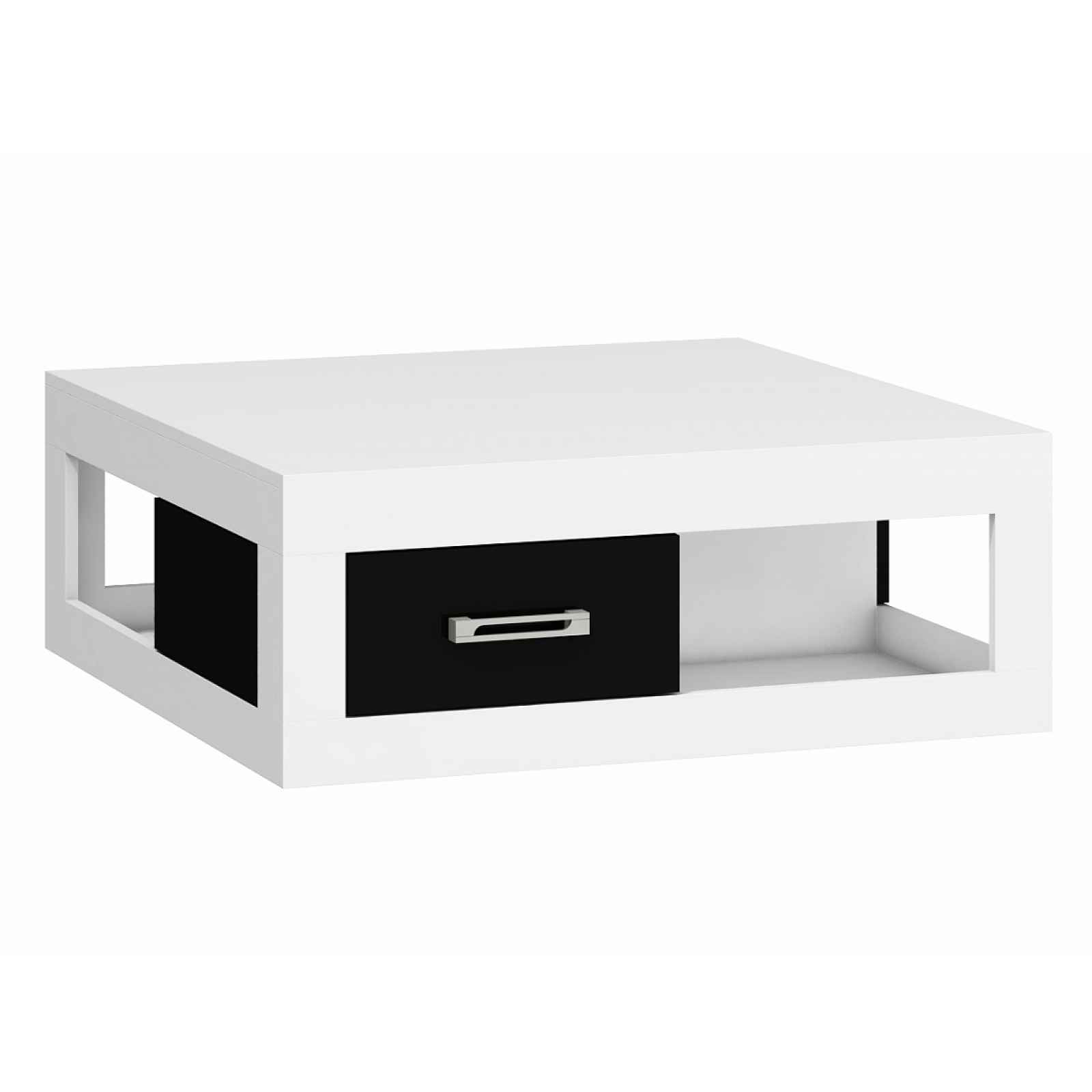 Konferenční stolek se zásuvkou Barva: bílá/černý lesk Materiál: lamino 16 mm Rozměry (šxvxhl): 90 x 34 x 94 cm Stříbrné úchytky jsou vyrobeny z tvrzeného PVC. Dodává se v demontu. Záruka 5 let.
