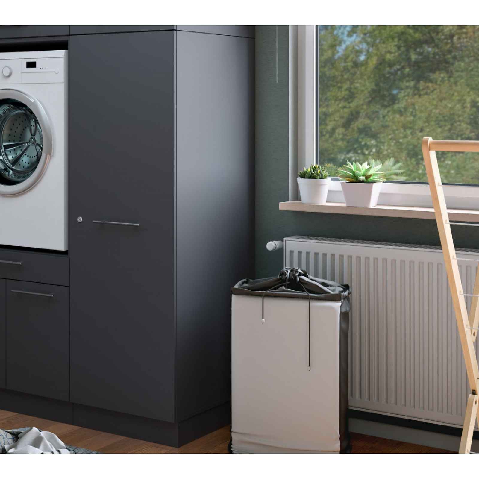 Víceúčelová skříň s policemi se zámkem z kolekce Mr. Sauber v antracitové barvě nabízí moderní a praktické úložné řešení do koupelny, prádelny nebo i jinam. Vysoká stojací skříňka se zámkem z kolekce Mr. Sauber představuje moderní, praktické a univerzální řešení úložného prostoru pro vaši koupelnu, domácí prádelnu nebo místnost pro úklid. Univerzální antracitové provedení snadno pasuje do jakékoliv místnosti. Skříň pomůže udržet pořádek nejen v koupelně, ale také v prádelně, šatně či jiné místnosti určené k úklidu. Čisté linie, moderní vzhled a snadná kombinovatelnost s ostatními prvky z programu z ní dělají funkční a estetický doplněk každé domácnosti. Ideální pro uspořádání všech vašich nezbytností se stylovou jednoduchostí. Vnitřní prostor skříně obsahuje 3 police pro univerzální ukládání různých věcí, které lze navíc bezpečně zamknout. Kombinací s dalšími elementy z této řady snadno vytvoříte funkční prostředí, kde budete mít vše prakticky uloženo. - víceúčelová skříň s policemi z programu Mr. Sauber - materiál: laminovaná dřevotříska 16 mm, kov, plast - dekor: antracitový mat - úchyt: kov, matně broušený - nožky/boční sokl: výškově nastavitelné nožky pro přesné vyrovnání skříně i na nerovné podlaze (nastavitelná výška 80 – 120 mm), plast, barva černá - mechanismus Soft Close: tlumené dovírání dveří - celková šířka: 50 cm - 1 x otočné dveře (uni montáž jako pravé/levé) - zabezpečení: 1 x zámek dveří – pro bezpečné uložení čisticích prostředků mimo dosah dětí, dokumentů nebo osobních věcí - členění vnitřního prostoru: 1 x vnitřní blok - vnitřní blok: úložný prostor, 3 x police, doporučená nosnost police do 5 kg - vyobrazení vnitřního prostoru skříně viz fotogalerie - doporučené ukotvení ke stěně (zadní 2-bodové ukotvení) - styl: moderní, univerzální - snadná kombinovatelnost s ostatními prvky z programu Mr. Sauber: místnost lze snadno přizpůsobit vašim potřebám - dodáváno v demontu