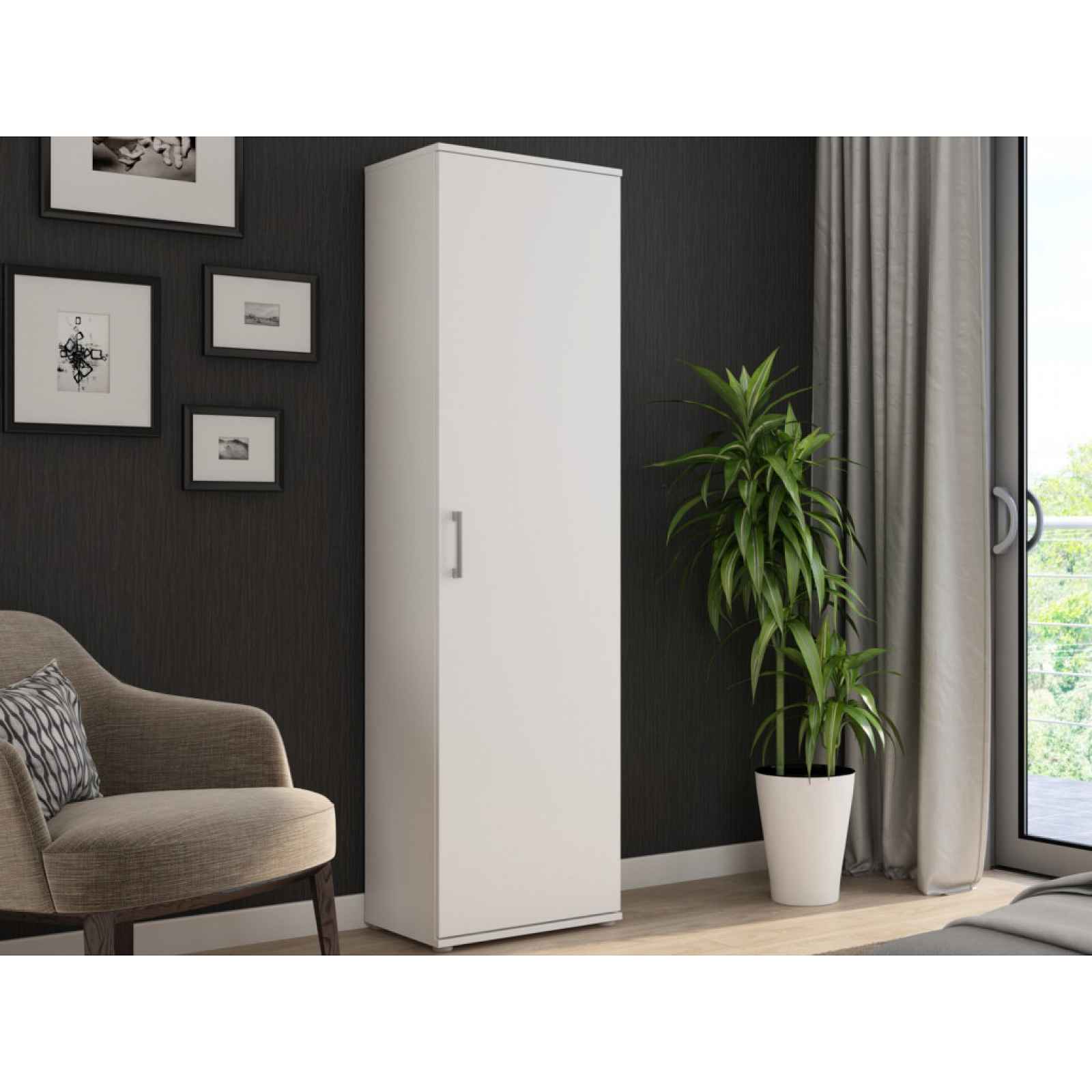 Víceúčelovou skříň o šířce 50 cm v bílé barvě můžete využít v jakékoliv místnosti. Vnitřní prostor obsahuje 4 police pro univerzální ukládání. Víceúčelovou skříň o šířce 50 cm v bílé barvě můžete využít v jakékoliv místnosti. Vnitřní prostor skříně obsahuje 4 police pro univerzální ukládání různých věcí. - materiál: laminovaná dřevotříska 16 mm, kov, plast - dekor: bílá mat - úchyty: plast, šedá alu - nožky: kluzáky, šedá alu - šířka: 50 cm - 1 x otočné dveře (uni montáž jako pravé/levé) - členění vnitřního prostoru: 1 x vnitřní blok - vnitřní blok: úložný prostor, 4 x police (2 x police výškově nastavitelná) - vyobrazení vnitřního prostoru skříně viz fotogalerie - doporučené ukotvení ke stěně - univerzální využití v různých místnostech - dodáváno v demontu