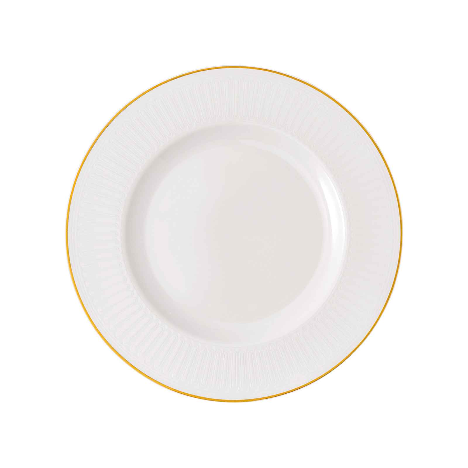 Jídelní talíř o průměru 28 cm z luxusní kolekce porcelánu Chateau Septfontaines německé značky Villeroy & Boch byl vyroben z kostního prémiového porcelánu s jedinečným dekorem ve stylu art deco. Zlaceno 20karátovým zlatem.