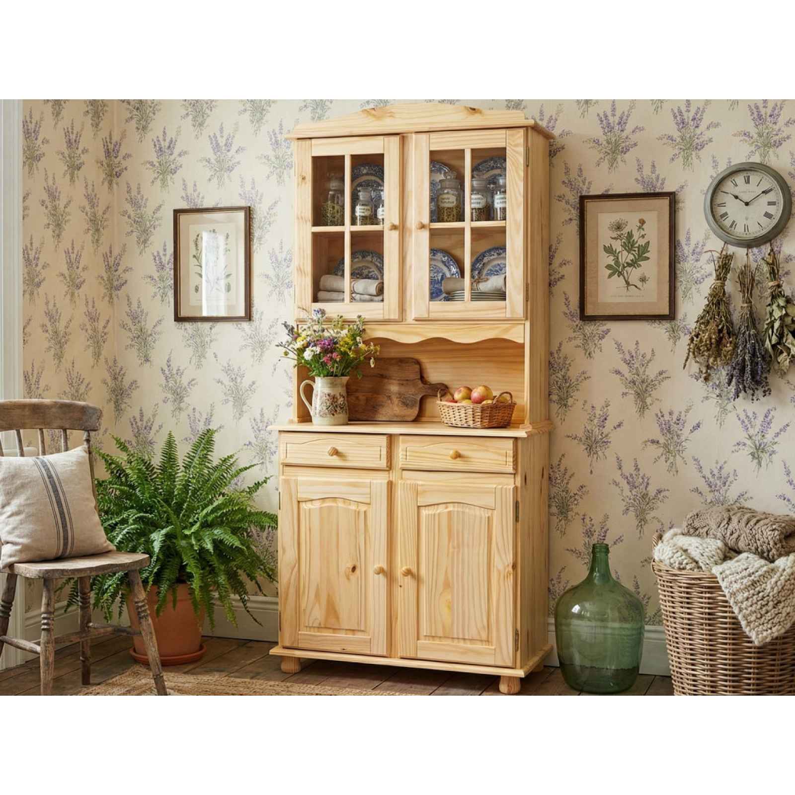 Vitrína v oblíbeném venkovském stylu je vyrobena z přirozeného borovicového dřeva. Dekorativní prolisy dveří, tvarované úchyty a masivní nohy dokonale dotváří útulnou atmosféru domova. - materiál: masivní borovicové dřevo, sololit, kov, čiré sklo - povrchová úprava: čirý bezbarvý lak - úchyty: stylově tvarované - nohy: dřevěné (přední nohy dekorativně tvarované) - dekorativní frézované prolisy předních ploch - 2 x dolní dveře (uvnitř úložný prostor, vnitřní police) - 2 x zásuvka (kovové boční pojezdy) - otevřený odkládací prostor uprostřed (dekorativní zaoblená římsa, hloubka odkládacího prostoru cca 28 cm, výška prostoru po horní římsu cca 28 cm, výška vnitřního prostoru přihrádky cca 35 cm) - 2 x horní dveře - prosklené (uvnitř úložný prostor, vnitřní police) - do vitríny můžete uložit jídelní servis, dekorace nebo knihy - stabilní konstrukce - oblíbený venkovský styl - dokonale dotváří útulnou atmosféru domova - dodáváno v demontu