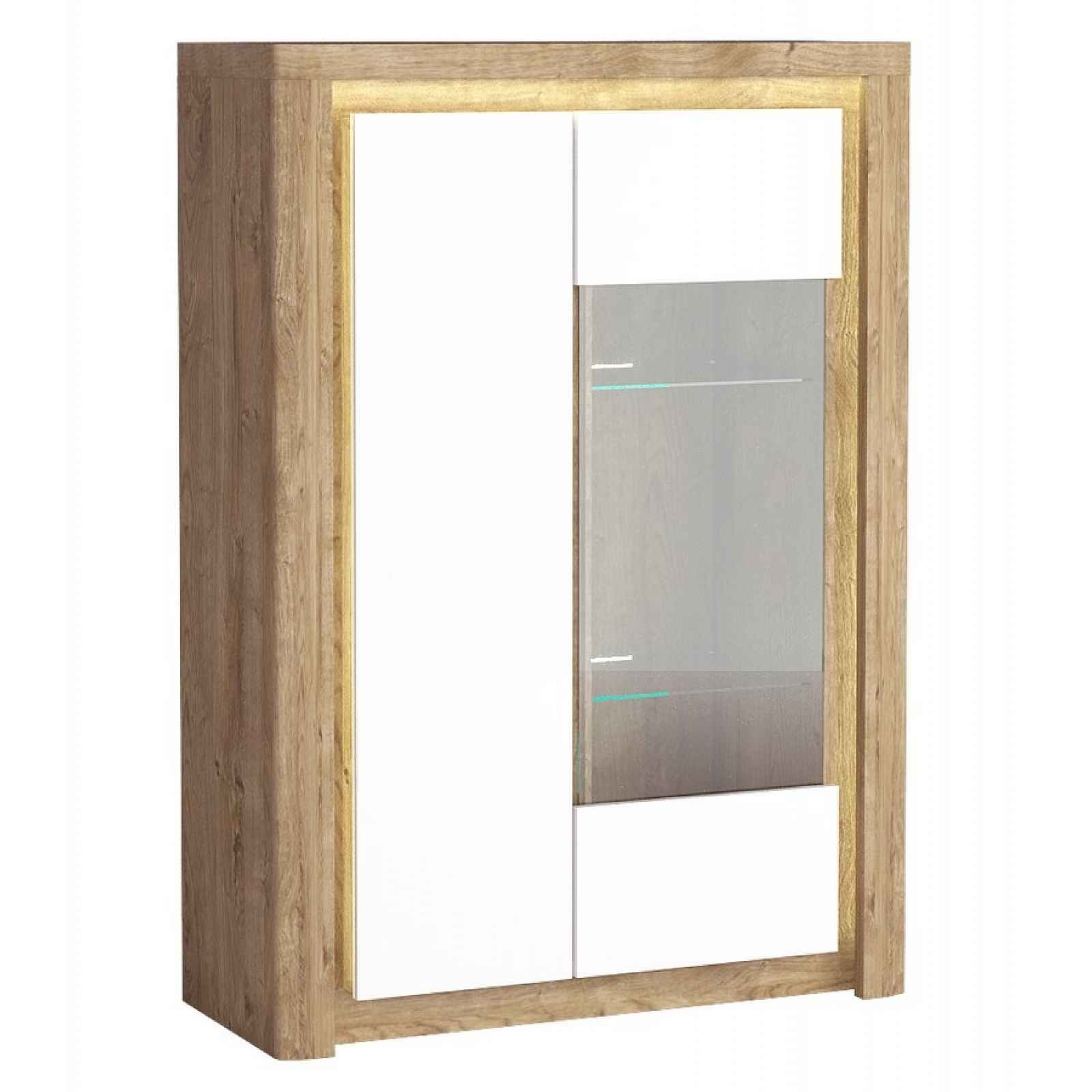 Vitrína nízká s LED osvětlením v moderním bezúchytovém provedení ze sektorové řady.Barva: dub ribbeck/bílý leskRozměry (šxvxh): 100 x 141 x 40,5 cmMateriál: kvalitní lamino ohraničené ABS páskou doplněno o lištu z MDF/skloDvířka jsou vybaveny systémem tichého dovírání, v pravé části doplněny tvrzeným sklem.Dodáváno v demontu.