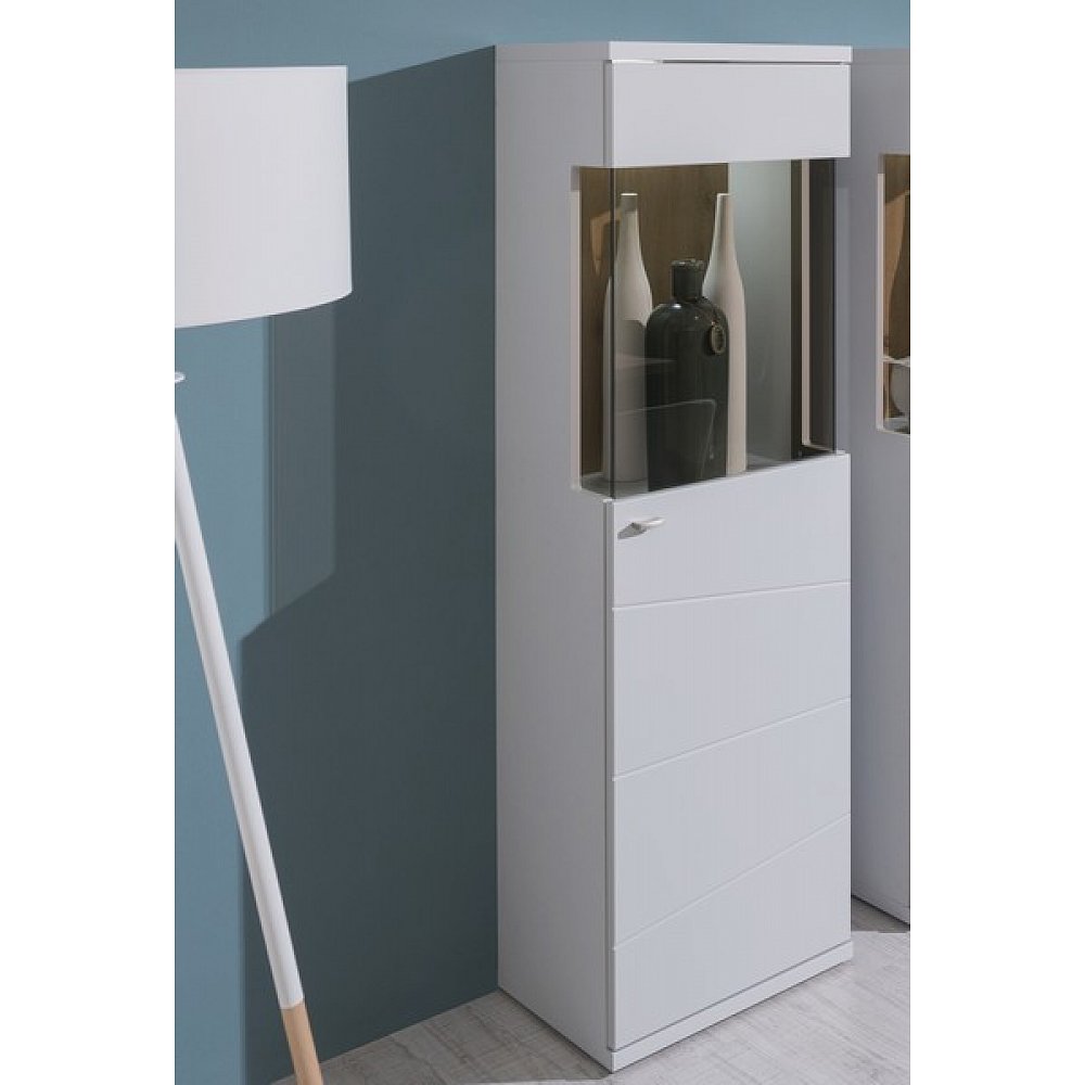 Máte-li rádi moderní design a zároveň kvalitu, pak je vitrínová skříňka Laval právě pro Vás. Matně bledě šedé plochy a útulný dřevodekor dubu artisan dokreslují frézované geometrické linie předních ploch, které nábytku dodávají zajímavou optiku. Polovysoká vitrína nabízí místo pro dekorace i úložný prostor. - materiál: dřevotříska 16 mm/28 mm (ABS hrany), MDF 19 mm, kov, sklo - dekor korpus: bledě šedý mat - dekor přední plochy: dub artisan/bledě šedý mat - úchyt: kovový profil, šedá alu barva - nožky: hranatý tvar, tvrzený plast, šedá alu barva - moderní design - zajímavá optika předních ploch – frézované geometrické linie - panoramatické rohové prosklení - celková výška: 158 cm - 1 x pravé dveře - částečně prosklené (vitráž/úložný prostor, 2 x dřevěná police) - zadní ukotvení ke stěně - kvalitní zpracování - vyrobeno na Slovensku - dodáváno v převážně smontovaném stavu