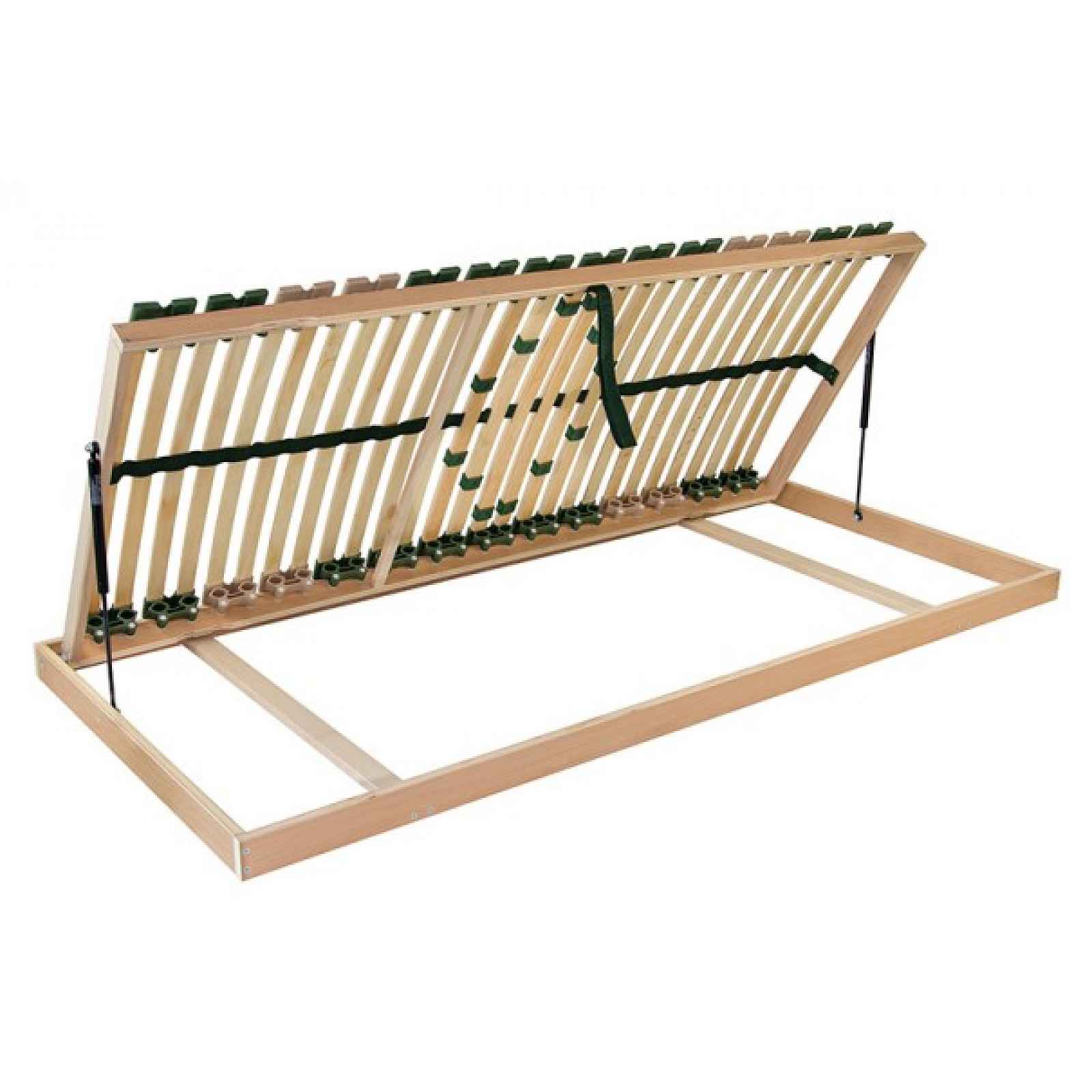 Výklopný rošt s 5 anatomickými zónami a 28 lamelami v kaučukových pouzdrech. Uložení pouzder nad bočnicí roštu zaručuje vyšší nosnost a dobrou odolnost proti jednorázovému zatížení, takže například při prudkém dosednutí na lůžko nedojde k jeho poškození. Pružné lamely v 7 anatomických zónách uložené ve dvojitých kaučukových pouzdrech se natáčejí a reagují po celé délce. Změkčení s pomocí speciálních otvorů vrtáním v ramenní oblasti zabezpečuje správou oporu páteře při spánku na boku. Středový popruh zlepšuje stabilitu roštu. Posuvnými objímkami lze nastavit individuální tuhost v bederní části na volbu tužší nebo měkčí. Foliované lamely usnadní údržbu roštu. Jednoduchý přístup k úložnému prostoru pod lůžkem. Velmi snadné zvednutí roštu pomocí pístu a úchytu z textilního popruhu. Přístup z boku do celého úložného prostoru. Světlost roštu: šířka - 1 cm, délka - 5 cm. Například pro rošt 90x200 cm je skutečný rozměr roštu 89x195 cm.