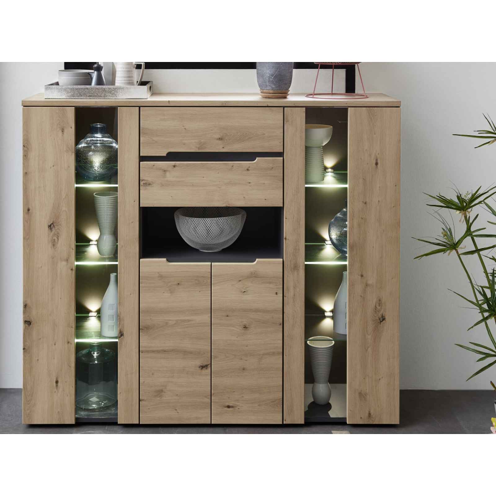Vysoká komoda z kolekce Memphis - nábytek v moderním a zároveň funkčním designu zaujme zajímavou profilací předních ploch. V kombinaci grafit/dub artisan. Vysoká komoda s osvětlením z programu Memphis – nábytek v moderním a zároveň funkčním designu zaujme zajímavou profilací předních ploch. Nábytek je vyroben v kontrastní kombinaci matný grafit s útulným dřevodekorem dub artisan. Tento moderní nábytek vytvoří elegantní atmosféru v interieru a zároveň prakticky poslouží v každé domácnosti. Vysoká komoda o šířce 145 cm má 2 zásuvky v horní části a 4 otočná dvířka. Dvě z nich disponují čirými skly, ideální pro prezentaci dekorací nebo nádobí. Bílé LED osvětlení polic s neutrálním tónem efektivně zvýrazňuje a rozjasňuje veškeré vystavené doplňky. - vysoká komoda s osvětlením z programu Memphis - materiál: laminová dřevotříska 16 mm/22 mm, MDF 18 mm, kov, plast, čiré sklo - dekor: grafit mat/dub artisan - úchyt: bezúchytové otevírání boční hranou - nožky: kluzáky, plast, černé - zajímavá profilace předních ploch - tiché dovírání dveří/zásuvek Softclose - moderní, elegantní styl - šířka: 145 cm - 2 x zásuvka (kovové boční pojezdy) - 1 x otevřená přihrádka (doporučená nosnost do 5 kg) - 1 x levé dveře částečně prosklené (úložný prostor, 3 x skleněná police - s osvětlením, max. nosnost do 3 kg) - 2 x středové dveře (úložný prostor, 1 x police, max. nosnost 5 kg) - 1 x pravé dveře částečně prosklené (úložný prostor, 3 x skleněná police - s osvětlením, max. nosnost do 3 kg) - včetně LED osvětlení polic: 6 x LED světlo, barva světla teplá bílá, včetně kabelu, trafa a nášlapného vypínače - vyrobeno v EU - dodáváno v demontu