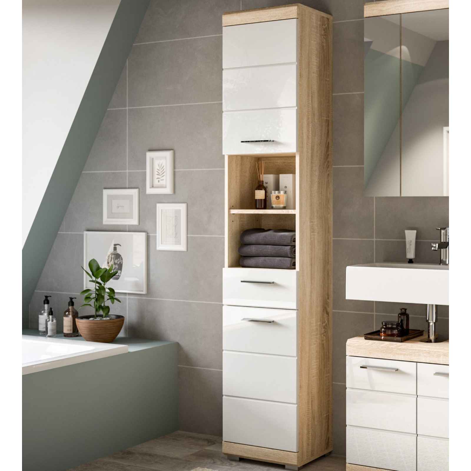 Vysoká koupelnová skříňka z řady Lambada - moderní, nadčasový a zároveň praktický nábytek do koupelny v kombinaci dub sonoma s bílým leskem. Vysoká koupelnová skříňka z řady Lambada – moderní, nadčasový a zároveň praktický nábytek do koupelny v kombinaci dub sonoma s leskle bílými přední plochami. Přední plochy se zkosenou hranou a decentně frézovanými liniemi jsou příjemným detailem. Za otočnými dvířky najdete úložné prostory a výškově nastavitelné poličky. Do otevřených přihrádek můžete snadno odkládat ručníky, osušky nebo třeba kosmetické potřeby. - vysoká koupelnová skříňka z řady Lambada - materiál: laminovaná dřevotříska 16 mm, MDF 16 mm, kov, plast - dekor korpus: dub sonoma - dekor přední plochy: bílá lesk - úchyt: plast, šedá alu - nožky: plast, šedá alu, výška 20 mm - zkosená hrana předního rámu - moderní a nadčasový styl - šířka: 37 cm - 1 x horní dveře (uni montáž pravé/levé, úložný prostor, 1 x police) - 2 x otevřená přihrádka (velikost cca 33,5x21x26 cm) - 1 x zásuvka (kovové boční pojezdy) - 1 x dolní dveře (uni montáž pravé/levé, úložný prostor, 1 x police) - doporučené ukotvení ke stěně - certifikát výrobku FSC (dřevěný materiál pocházející z ekologicky obhospodařených certifikovaných lesů) - kvalita/péče: kvalitní materiály a solidní zpracování zajišťují dlouhou životnost a stabilitu, povrchy se snadno udržují a čistí, což umožňuje dlouhodobé používání a snadnou údržbu - dodáváno v demontu