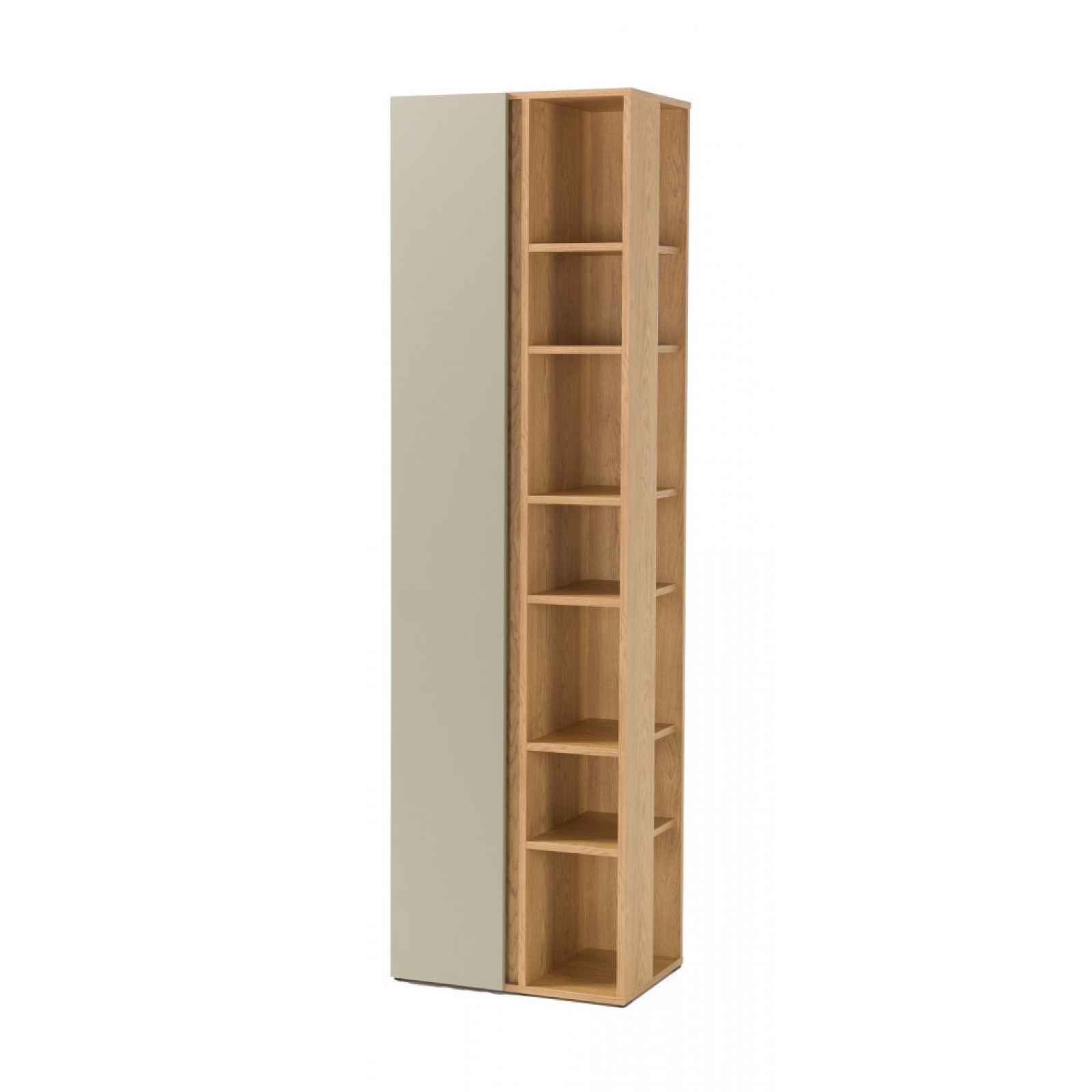 Vysoká skříňka s regálem z kolekce Lucky - nábytek v nadčasovém minimalistickém stylu pasuje univerzálně do dětského pokoje, pokoje teenagerů i domácí pracovny. Vysoký úložný regál s dveřmi – nábytek v nadčasovém minimalistickém stylu pasuje univerzálně do dětského pokoje, pokoje teenagerů i třeba domácí pracovny, kde vždy prakticky poslouží. Tento univerzální nábytek lze využít v každém moderním interieru a téměř každé místnosti vašeho bytu. Skříňka o šířce 55 cm a výšce 194 cm má několik otevřených přihrádek a 1 dveře, za kterými najdete úložné prostory s policemi. - vysoká úložná skříňka s regálem z kolekce Lucky - materiál: laminovaná dřevotříska 16 mm (ABS hrany), kov, plast - dekor: eukalyptově zelená mat/baltský dub - úchyt: bezúchytové otevírání boční hranou - podnož: kov, hranatý profil, černý lak, výška 13 cm - moderní minimalistický design - univerzální pro všechny věkové kategorie (dětský pokojíček, pokoj teenagerů, pro dospělé, do pracovny atd.) - šířka: 55 cm - výška: 194 cm - 1 x levé dveře (úložný prostor, 4 x police) - efekt 14 otevřených přihrádek: konstrukce nabízí 7 úrovní úložného prostoru přístupných ze dvou stran (7 zepředu + 7 z boku), 6 vodorovných polic je v rohu vizuálně rozděleno jednou svislou lištou - stabilní konstrukce - dodáváno v demontu