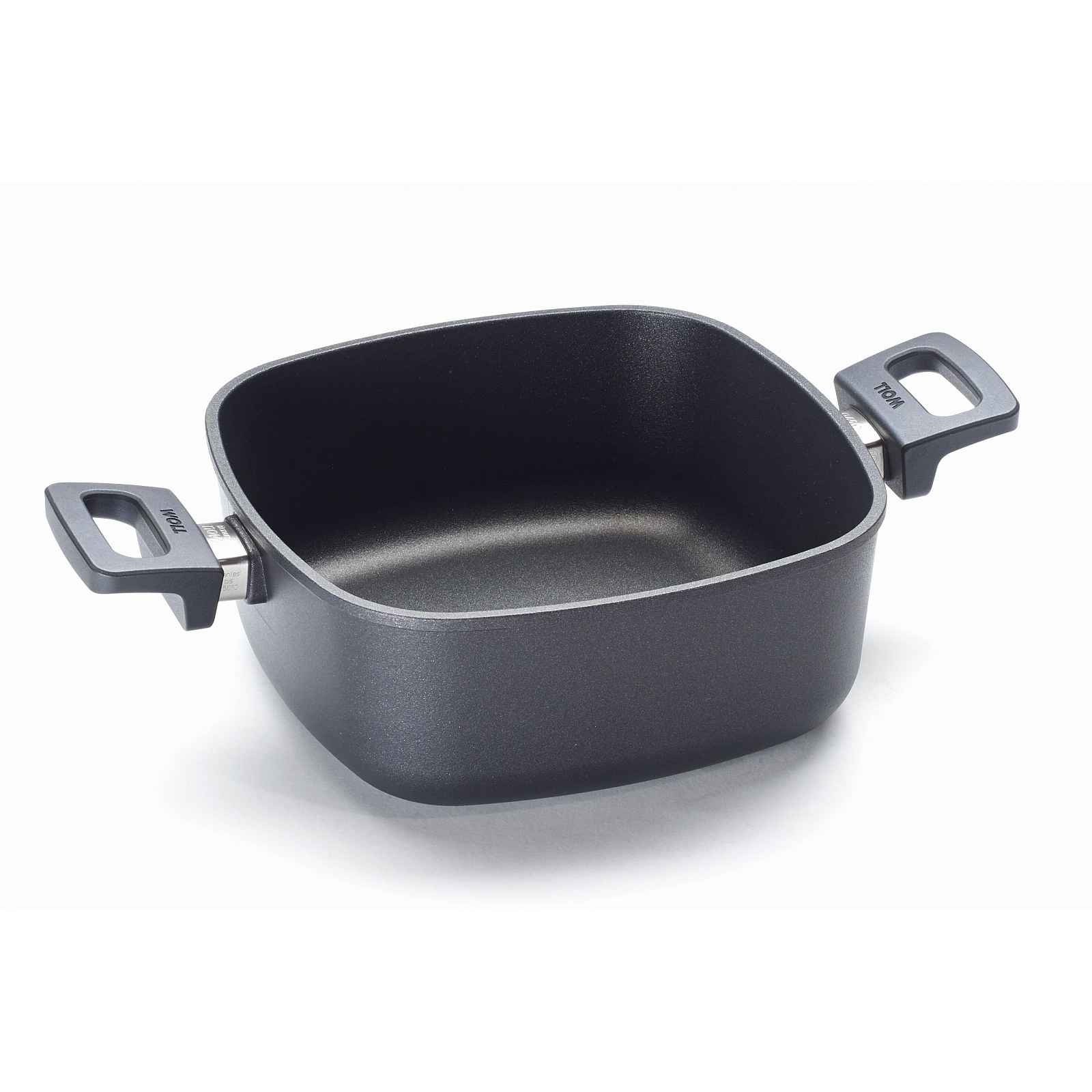 Čtvercový kastrol s pevně uchycenou rukojetí od německého výrobce Woll, kolekce Titanium Nowo. Vyrobeno z hliníkové slitiny, odolný nepřilnavý povrch.