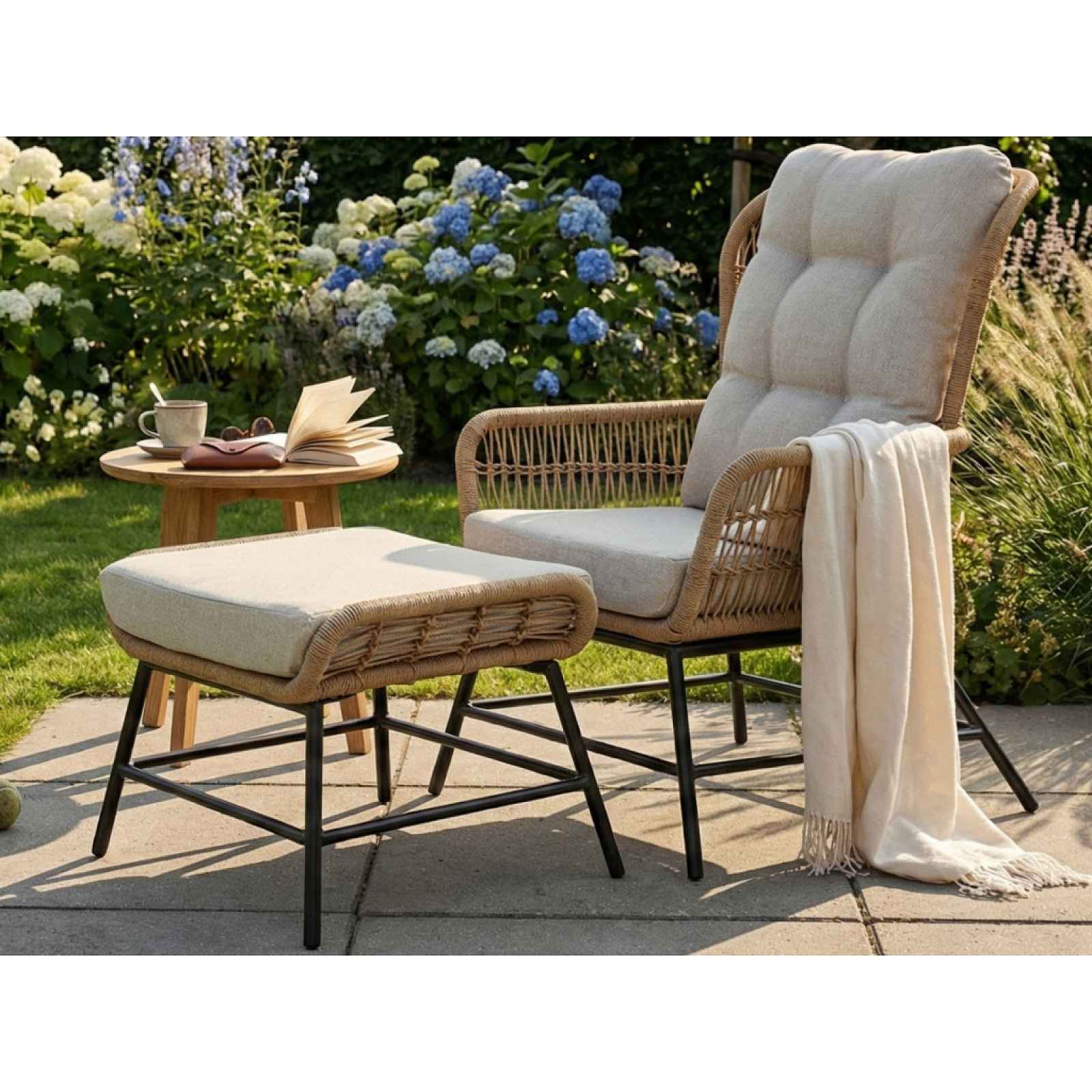 Atraktivní zahradní křeslo s taburetem má kovovou konstrukci doplněnou elegantním výpletem z umělé imitace ratanu, který dodává elegantní a nadčasový vzhled. Dopřejte si pohodlí a styl v jednom. Toto atraktivní zahradní křeslo s taburetem má stabilní kovovou konstrukci doplněnou elegantním výpletem z umělé imitace ratanu, který dodává nábytku elegantní a nadčasový vzhled. Díky měkkým polštářům si užijete komfortní posezení během celého dne. Součástí setu je praktický taburet, který můžete využít jako pohodlnou opěrku pro nohy při relaxaci nebo jako samostatné malé sedátko třeba pro návštěvu. Křeslo je ideální pro chvíle odpočinku, posezení u kávy nebo při čtení oblíbené knihy. Skvěle se hodí na terasu, zahradu či balkon, ale díky svému stylovému designu bude stejně dobře vypadat i v interieru vašeho bytu, kde vytvoří příjemnou a útulnou atmosféru. - sada obsahuje: křeslo + taburet - stabilní konstrukce: kov - podnož/nohy: kov - povrchová úprava: černý lak - výplet: imitace umělého ratanu (PE), barva: přírodní béžová - umělý ratan dobře odolává nepříznivým vlivům počasí, proto je vhodný pro využití ve venkovním prostředí - zaoblené tvary - atraktivní design - 1 x sedací polstr křesla/1 x opěrný polštář křesla/1 x sedací polstr taburetu (polyuretanový výplň, polyesterová látka, barva béžová, snímatelný potah na zip, výška polstru 8 cm) - rozměry křeslo: 79,5x98x68 cm - výška sedu (s polstrem): cca 45 cm - hloubka sedu: 53,5 cm - rozměry taburet: 68x42x48 cm (výška s polstrem 45 cm) - na venkovní zahradu, terasu, balkon, zimní zahradu - také do interieru - doporučená nosnost křesla do 110 kg - doporučená nosnost taburetu do 110 kg - dodáváno v demontu
