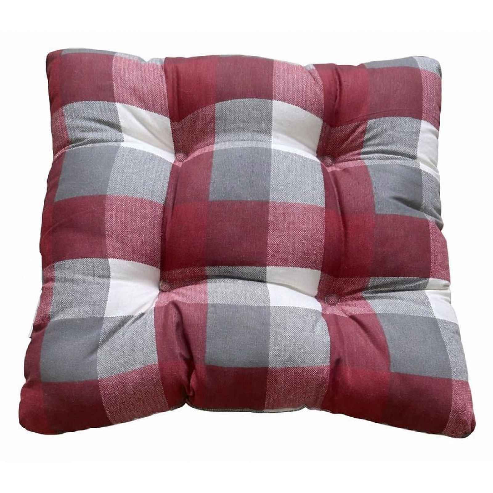 Příjemně měkký podsedák na židli, křeslo nebo lavici s vínovo-šedým kostkovaným vzorem zvýší komfort sezení v domácnosti nebo na zahradě. Rozměr 40×40 cm. - polstr na židle, křesla a lavice - rozměry: cca 40×40 cm - materiál potahu: 52% polyester/48% bavlna, 110 g/m² - materiál výplně: 100% polyester, 350 g/m² - 4bodové prošívání: drží výplň na místě, nadýchaný vzhled - barva: vínová červená, šedá - vzor: káro - praní pouze v ruce - univerzální využití v domácnosti, na zahradě nebo chatě