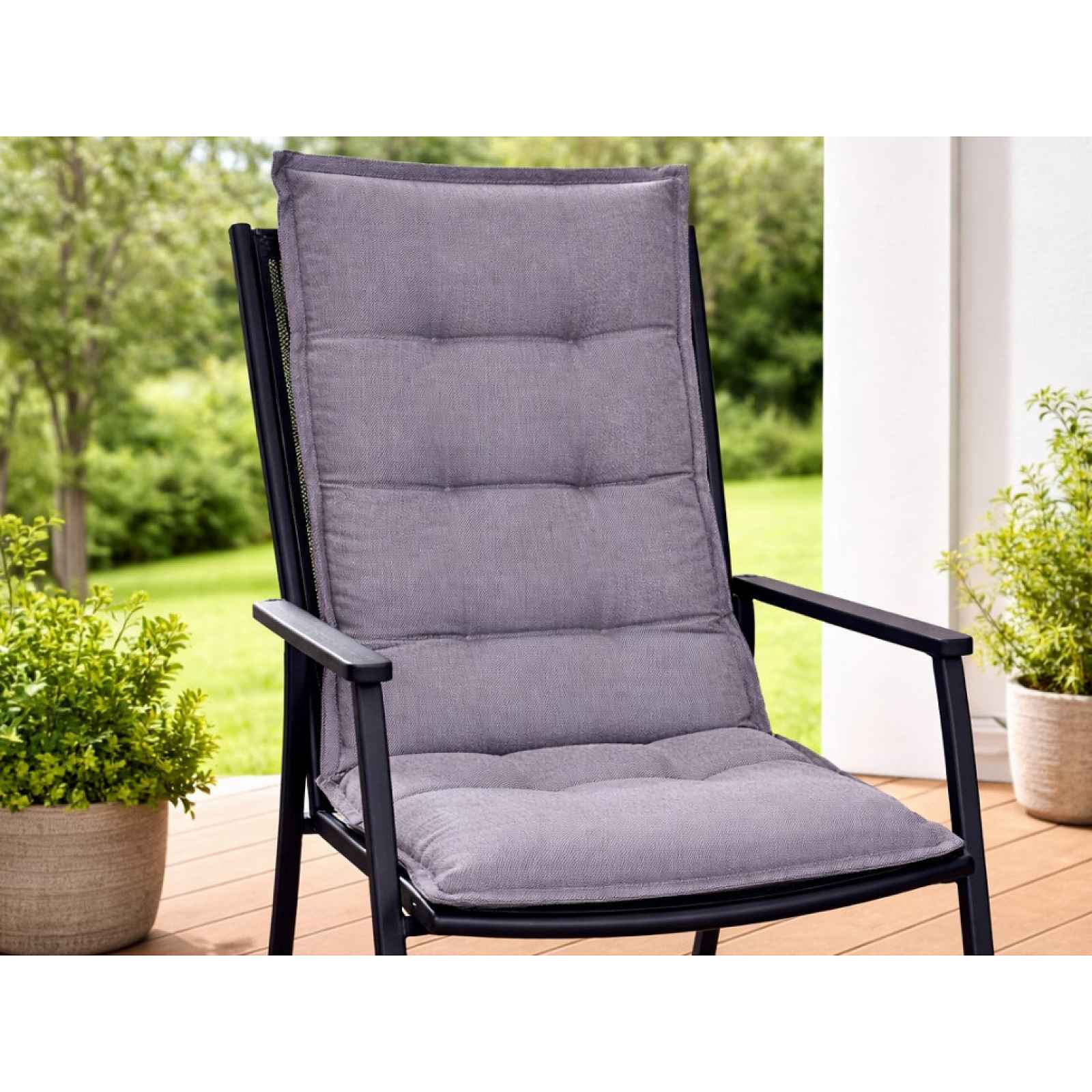Příjemně měkký podsedák na židli či křeslo s vysokým opěradlem v univerzální neutrální antracitové barvě zvýší komfort sezení na zahradě. Rozměr 50×118 cm. - polstr na židle či křesla s vysokou opěrkou - rozměry: cca 50×118 cm - materiál potahu: 52% polyester/48% bavlna, 165 g/m² - materiál výplně: polyuretanová pěna, 100% polyester, 300 g/m² - 6bodové kruhové prošívání a zpevněný okraj: drží výplň na místě, nadýchaný vzhled - barva: antracitová - uchycení: guma na zadní straně, tkaničky - praní pouze v ruce - vhodné na venkovní židli a křeslo