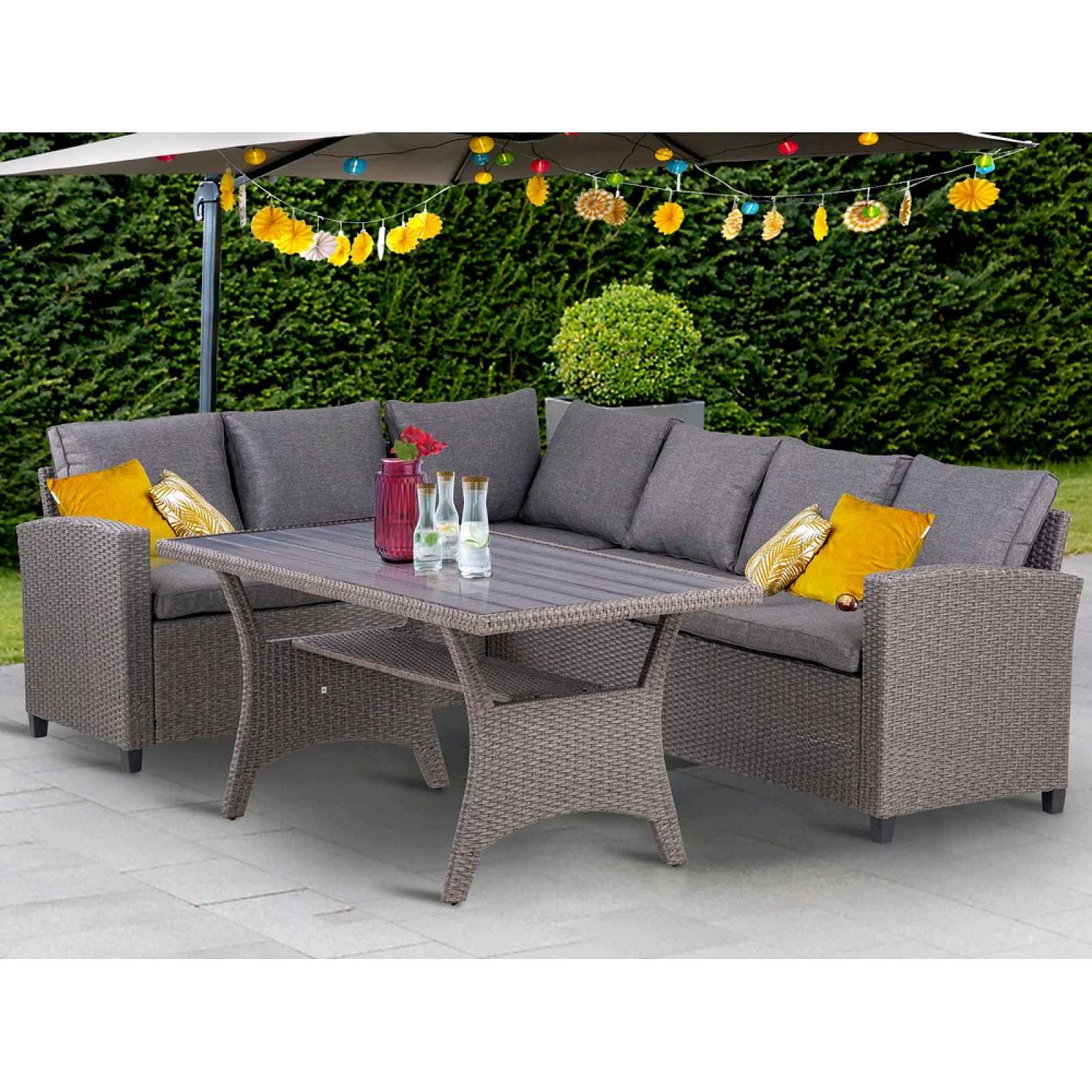 Zahradní rohová lavice s jídelním stolem a polštáři bude oblíbeným místem pro pohodlnou relaxaci a trávení společných chvil na čerstvém vzduchu vaší zahrady. Stabilní konstrukce z kovu a umělé imitace šedého ratanu je ideální volbou do venkovního prostředí. - zahradní sestava obsahuje: 1 x rohová lavice (sedačka), 1 x jídelní stůl - stabilní konstrukce: kov - povrch: imitace umělého ratanu, barva: šedý melír - umělý ratan dobře odolává nepříznivým vlivům počasí, proto je vhodný pro využití ve venkovním prostředí - rohová lavice (sedačka): boční područky, sedací polštáře (výška cca 7 cm), opěrné polštáře, polyuretanová výplň, potah polštářů – snímatelný na zip, plochá polyesterová tkanina (100% polyester, ruční praní), barva antracitová šedá, rozměry rohu: 178/234x73x64 cm - jídelní stůl: obdélný tvar 145x74 cm, jídelní plocha – umělá imitace dřevěných prken (tvrzené plastové profily imitují plochá dřevěná prkna se strukturovaným povrchem, barva šedá), široká podnož, dolní odkládací přihrádka, rozměry stolu: 145x67x74 cm - výška sedu (se sedacím polštářem): 47 cm - hloubka sedu (s opěrným polštářem): 43 cm - do venkovního prostředí (i do zimní zahrady nebo interieru) - doporučená nosnost sedáku do 100 kg - doporučená nosnost stolu do 30 kg - dodáváno bez vyobrazených zahradních taburetů (k zakoupení samostatně) - dodáváno v demontu