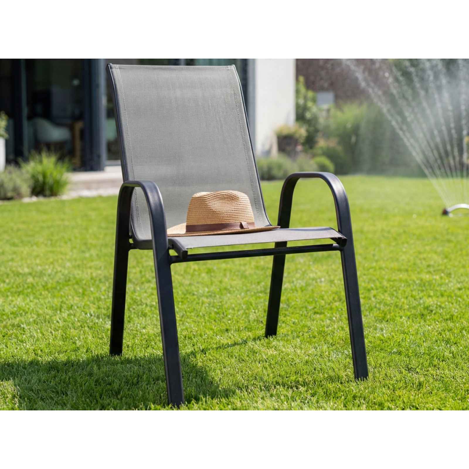 Moderní zahradní židle se zaoblenou kovovou konstrukcí a područkami poslouží u zahradního stolu nebo i samostatně. Sedací části vyrobeny z šedé umělé tkaniny. Moderní zahradní židle se zaoblenou kovovou konstrukcí a područkami poslouží u zahradního stolu nebo i samostatně. Sedací části vyrobeny z šedé umělé tkaniny, která je odolná vůči vlivům venkovního prostředí. U tohoto zahradního křesla je možné stohovat více kusů na sebe a ušetřit tak okolní prostor při skladování. - stabilní konstrukce: kov - povrchová úprava: černý lak - podnož/nohy: profil 42x14 mm - sedací/opěrná část: umělá imitace tkaniny, barva šedá - pohodlně zaoblený tvar - zaoblené boční područky - stohovatelné: možnost stohování více kusů na sebe, ušetříte tak prostor při skladování - na zahradu, balkon či terasu - využití samostatně jako křeslo pro relaxaci anebo k zahradnímu stolu jako jídelní židle - moderní styl - doporučená nosnost do 110 kg - bez polštáře a doplňků - dodáváno ve složeném stavu