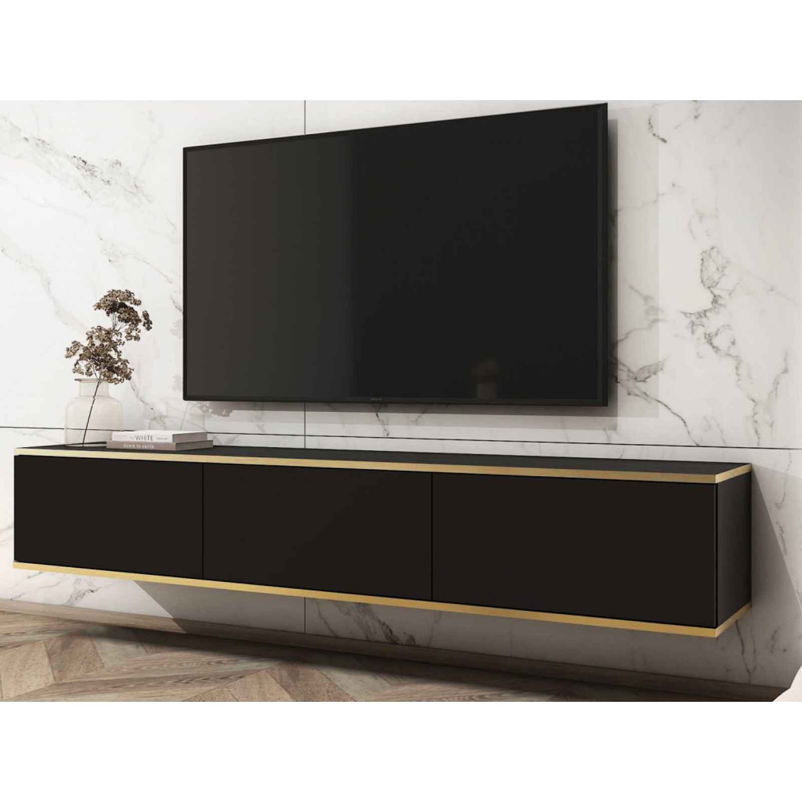 Závěsná TV skříňka o šířce 175 cm v černé barvě skvěle doplní moderně zařízený interier. Plochy skříňky doplňují linie zlatého orámování pro luxusní efekt. Závěsná TV skříňka o šířce 175 cm v černé barvě skvěle doplní moderně zařízený interier. Plochy skříňky doplňují linie zlatého orámování, díky kterým působí luxusně. Tento stylový televizní stolek je navíc velmi praktický - díky zavěšení na zeď šetří prostor, usnaďnuje úklid podlahy a navíc působí v místnosti vzdušně. Ideální volba pro ty, kde hledají kombinaci funkčnosti a stylového designu. - TV skříňka z řady Orfeo - materiál: laminovaná dřevotříska 16 mm (ABS hrany 0,5 mm), kov, plast - dekor korpus: černá mat - dekor přední plochy: černá mat - horizontální zlaté linie - úchyt: bezúchytové otevírání Push to open - pro zavěšení na stěnu (zadní 4-bodové zavěšení) - moderní a elegantní glamour styl - šířka: 175 cm - 1 x levé výklopné dveře (otevřený úložný prostor) - 1 x středové výklopné dveře (otevřený úložný prostor) - 1 x pravé výklopné dveře (otevřený úložný prostor) - stabilní - vyrobeno v EU - dodáváno v demontu