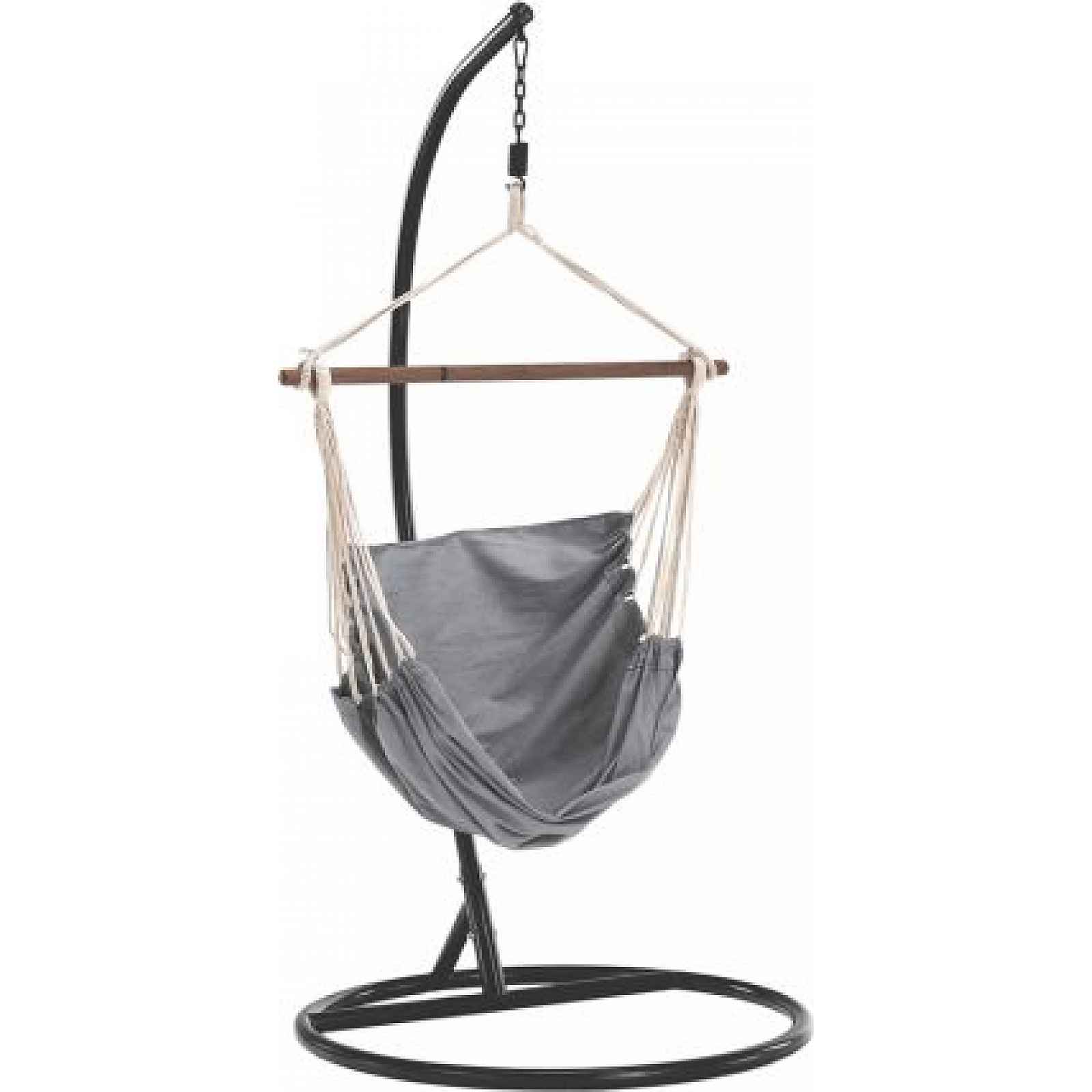 Závěsné houpací křeslo LINDO NEW v bílo-šedém provedení je vyrobené z kvalitního materiálu - 65% bavlna, 35% polyester. Držák je ze dřeva. Stojan není součástí balení, můžete si ho doobjednat (viz související produkty).
