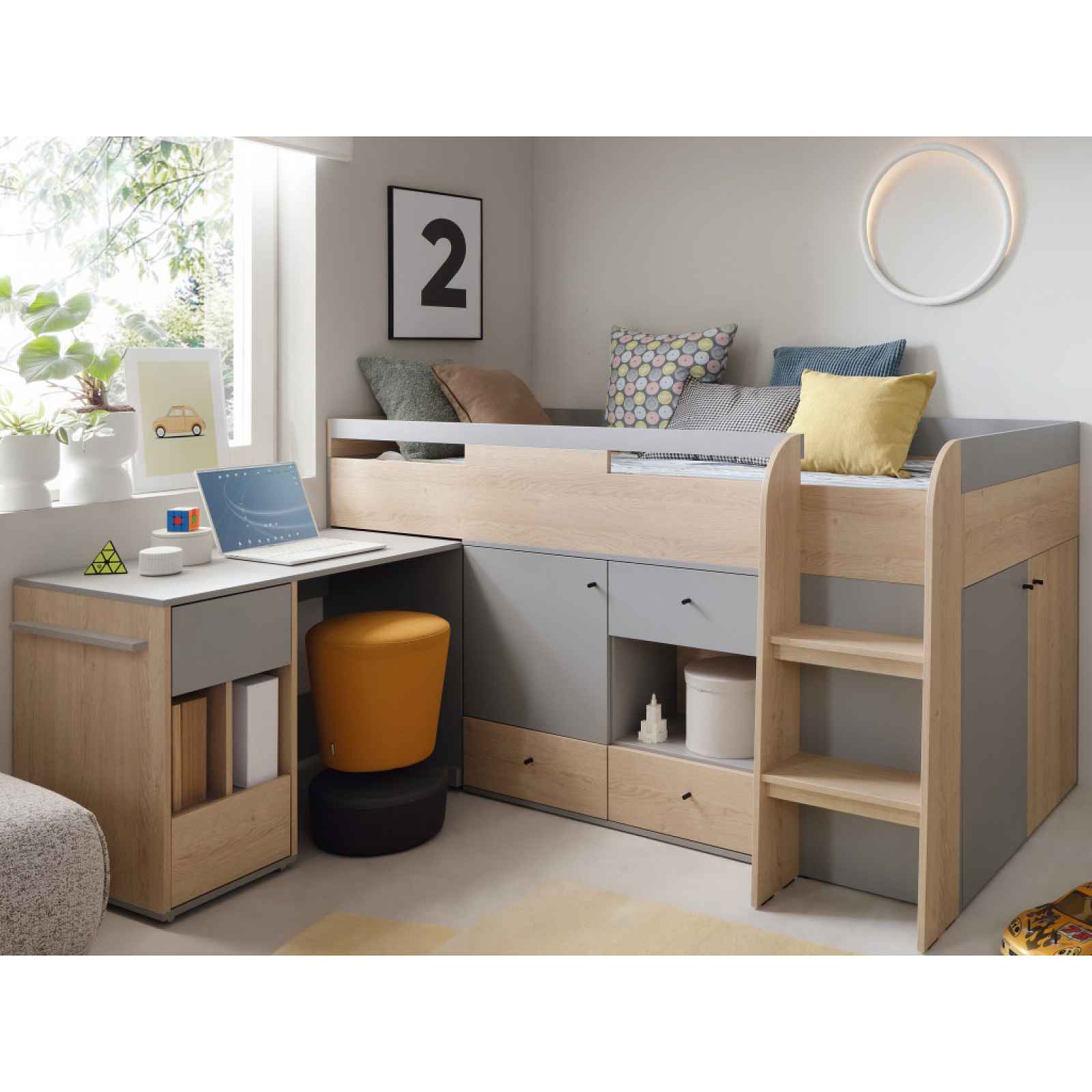 Zvýšená úložná postel se stolkem z kolekce Room - moderní nábytek v harmonické kombinaci matná šedá s útulným dobovým dekorem pasuje do každého pokoje. Praktická kompaktní konstrukce z kolekce Room obsahuje postel, skříňky, zásuvky i psací stůl – vše v jednom. Moderní nábytek v harmonické kombinaci matná šedá s útulným dobovým dekorem pasuje univerzálně do každého dětského či studentského pokoje a je ideálním řešením pro vybavení například malé místnosti. K lůžku o velikosti 90×200 cm se dostanete po schůdcích. Praktický systém skříněk a zásuvek získáte spoustu úložného prostoru na hračky, dekorace nebo třeba knížky. Výsuvný psací stůl se zásuvkami i přihrádkami lze po práci snadno zcela zasunout pod konstrukci postele, čímž uvolníte místo pro hraní. Skvělý, kompaktní a prakticky řešený nábytek pro dětský pokoj, teenagery i třeba dospělé. - zvýšená úložná postel se stolkem z kolekce Room - materiál: laminovaná dřevotříska 16 mm, kov, plast - dekor: dub biscuit/šedá mat - úchyt: zakulacený tvar, plast, černá - moderní design - praktická kompaktní konstrukce obsahuje: zvýšená postel s bočními schůdky + úložné prostory + výsuvný psací stůl - ideální řešení pro vybavení malé místnosti - určeno pro děti, mladistvé i dospělé - zvýšená postel: plocha lůžka 90×200 cm - 1 x rošt (pevná plochá deska, ventilační průduchy) - bez matrace (kombinovat s 1 ks matrace velikosti 90×200 cm) - boční zábradlí okolo lůžka - pro bezpečný spánek - integrované schůdky: 2 pevné stupně (výška 105 cm, hloubka nášlapů 15/18 cm) - integrovaná boční skříňka: 2 x otočné dveře (úložný prostor, 1 x police - 90,6x39 cm), celkové rozměry skříně cca: 90,6×72×44,5 cm - integrovaný úložný blok: 1 × otevřená přihrádka, 3 x zásuvka (kovové boční pojezdy), 1 x otočné dveře (úložný prostor, 1 x police), celkové rozměry cca: 102,6x72x32 cm - výsuvný psací stůl na kolečkách: snadné zasunutí pod lůžko pro úsporu místa, 2 x otevřená přihrádka, 2 x zásuvka, celkové rozměry stolu cca: 95x72x55 cm - dodáváno v demontu